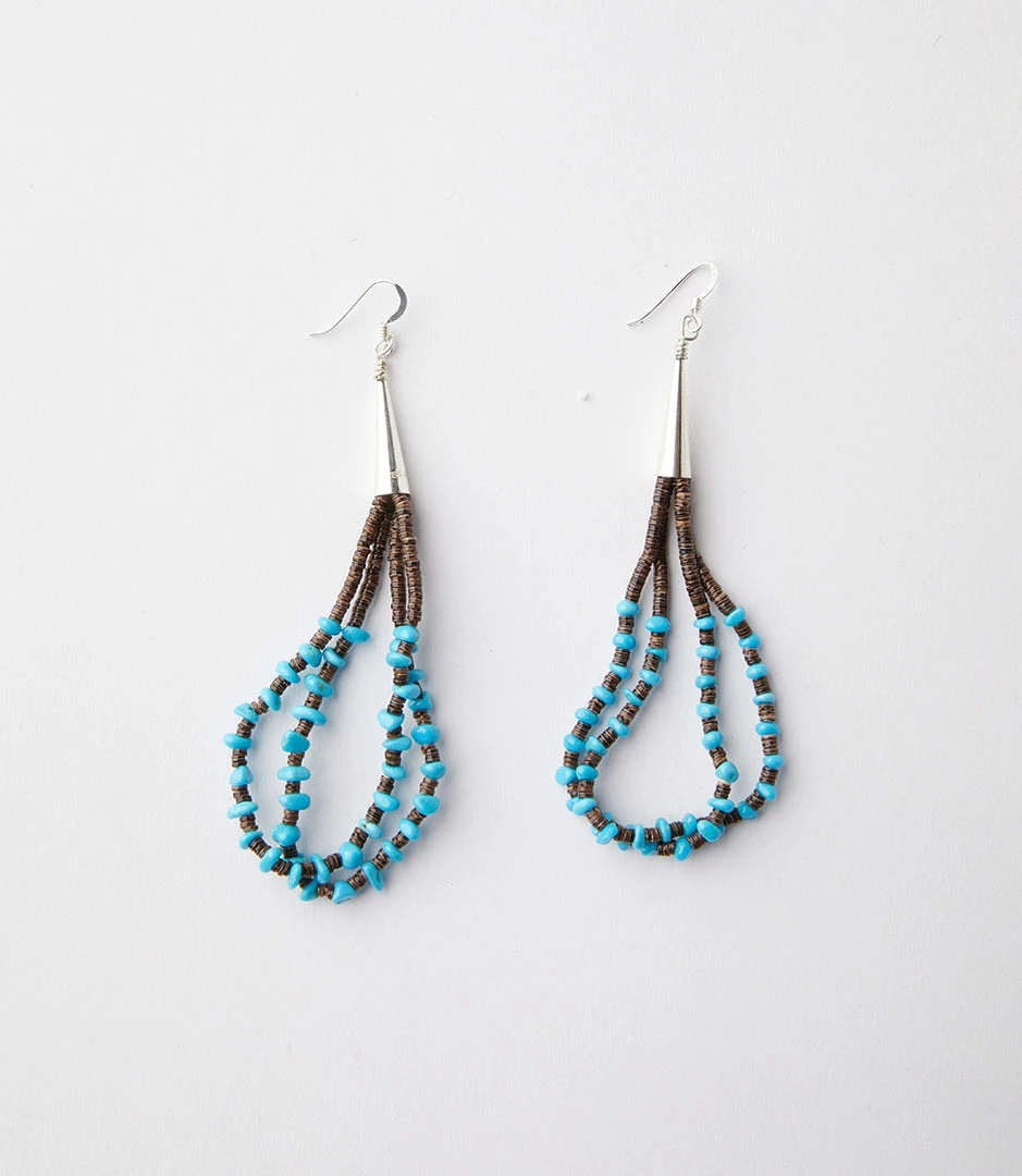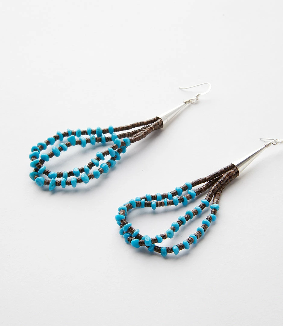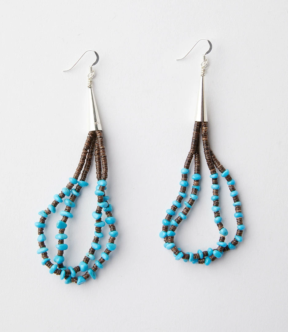 Handcrafted by Native American artisans, these beaded earrings are made of turquoise and brown shell heishi.