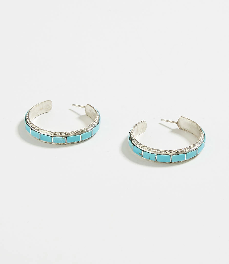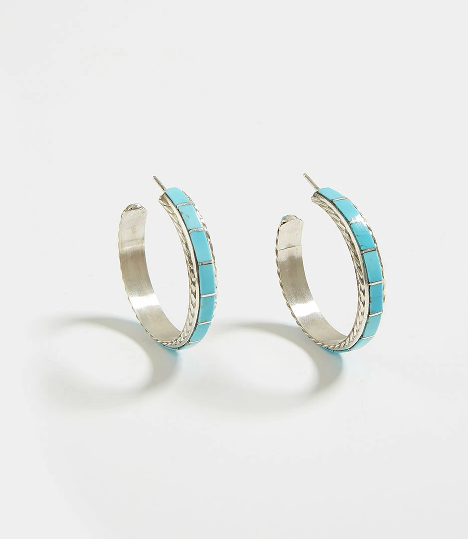 These sterling silver earrings were delicately made by a Navajo artist. It features a stunning geometric pattern crafted from turquoise inlay.