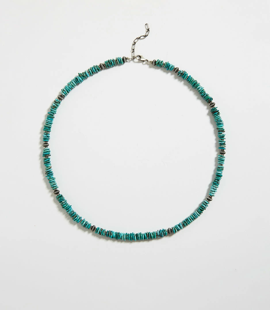Made by a Navajo Artist, this beautifully crafted necklace is made of turquoise stones with hints of earthy tones. It also detailed with sterling silver accents.