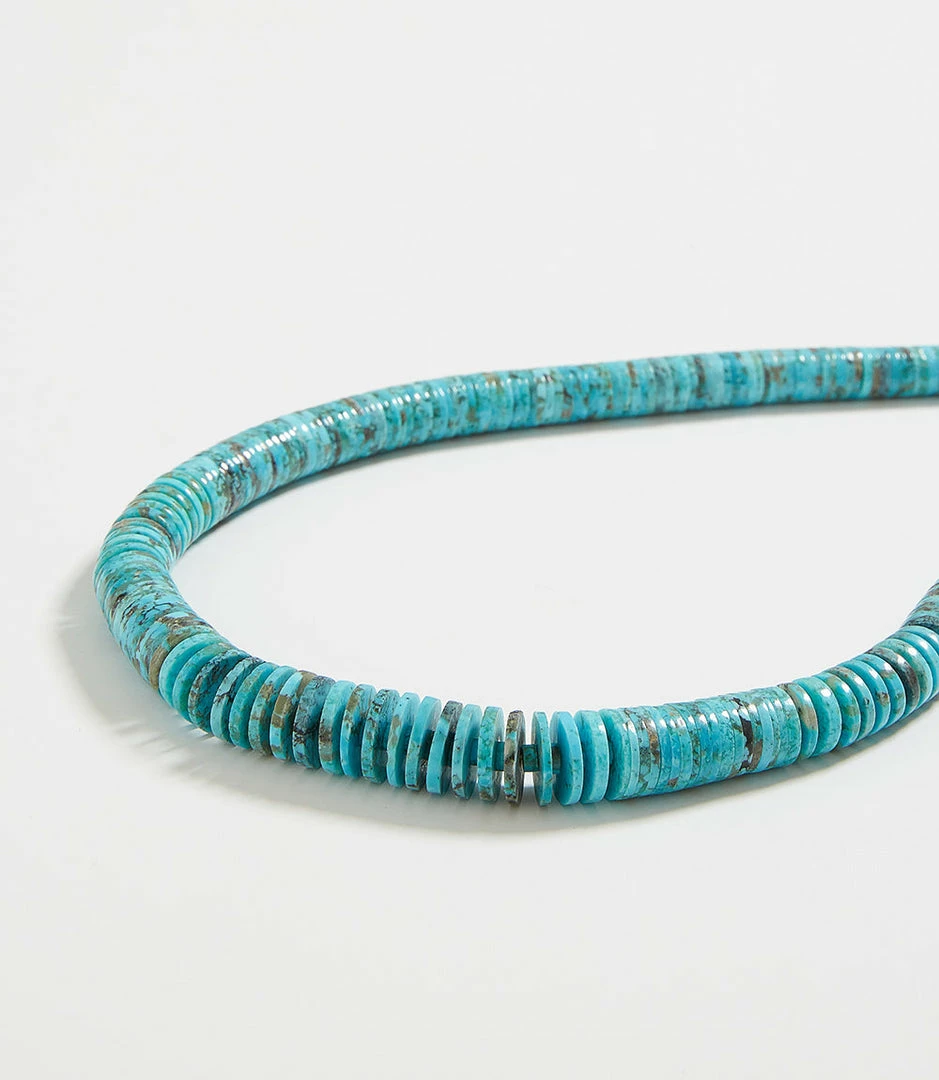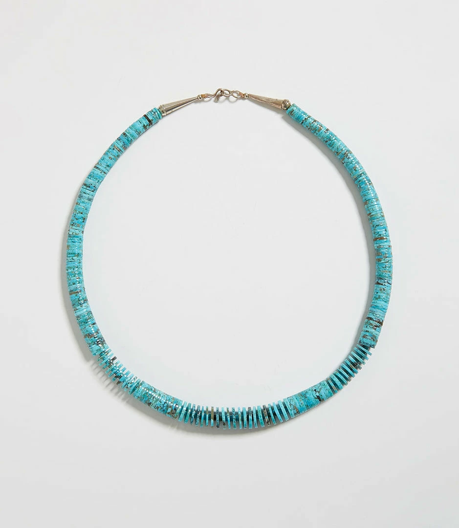 Made by Navajo Artist Santo Domingo, this beautifully crafted necklace is made of turquoise stones with hints of earthy tones.