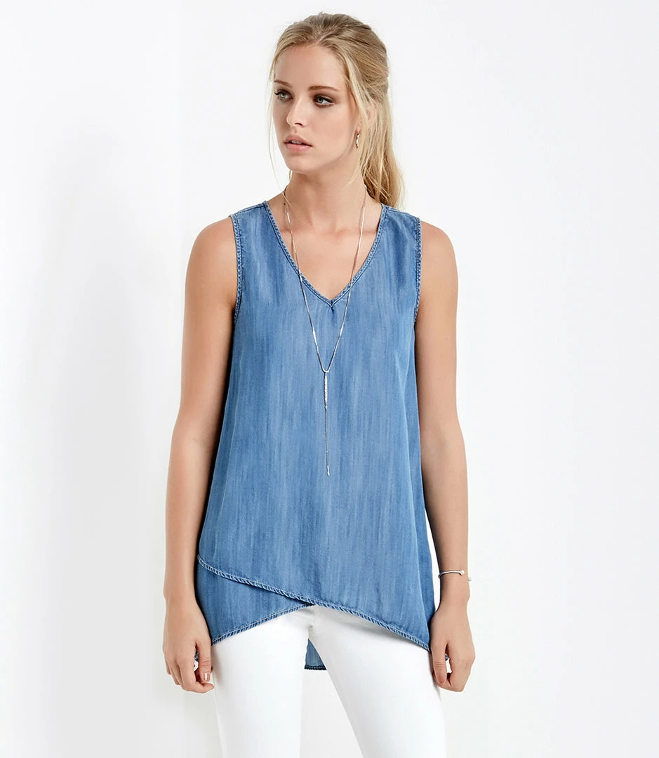 Lightweight chambray shapes a v-neck tank top with a stylish faux wrap front that dips into a longer back hem.