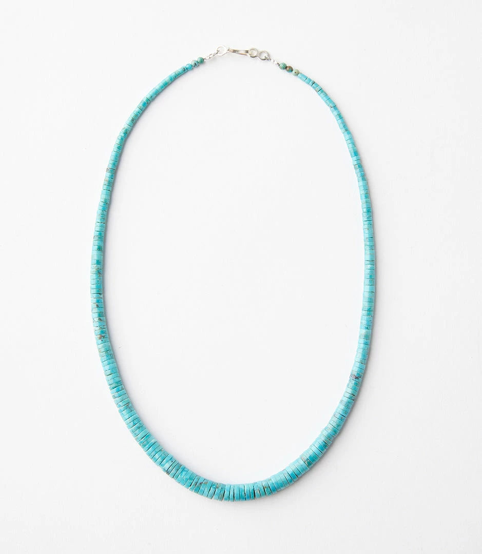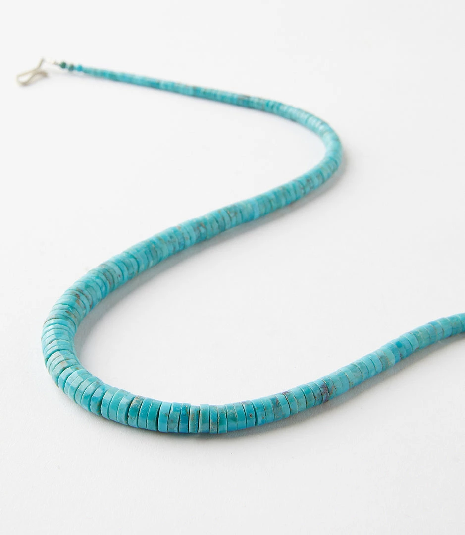 Handcrafted by Native American artisans, this stunning necklace is made of a single strand of turquoise stones and is finished with a sterling silver hook and eye closure.