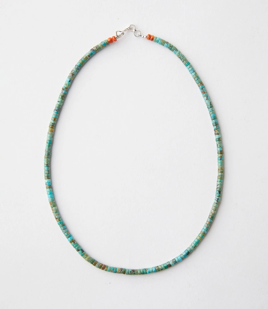 Made by a Navajo Artist, this beautifully crafted necklace is made of turquoise stones with hints of earthy tones.