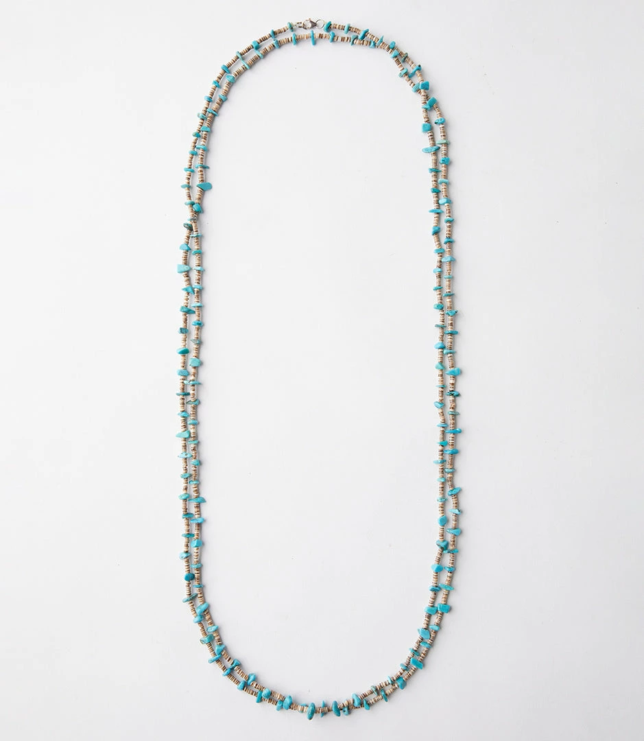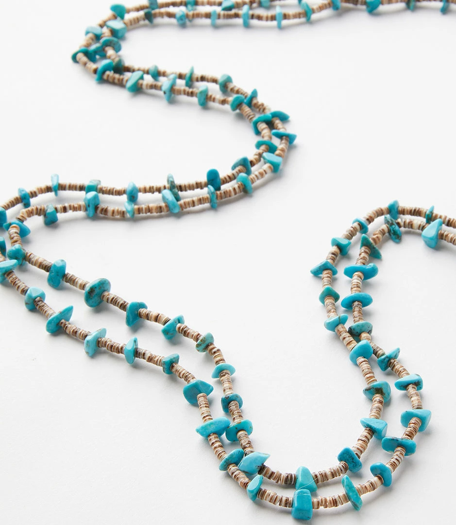 Handcrafted by Native American artisans, this beautifully made necklace is detailed turquoise stones and shell heishi.
