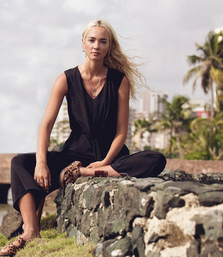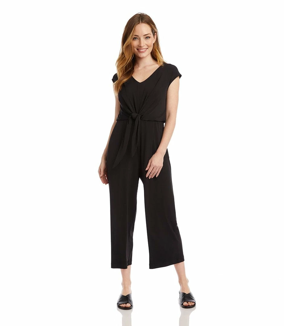 Fluid knit fabric shapes this ultra-flattering jumpsuit detailed with a fitted waist accentuated with a stylish tie-front. A cropped cut and surplice neckline take the casual appeal of this stretch-knit jumpsuit to the next level.