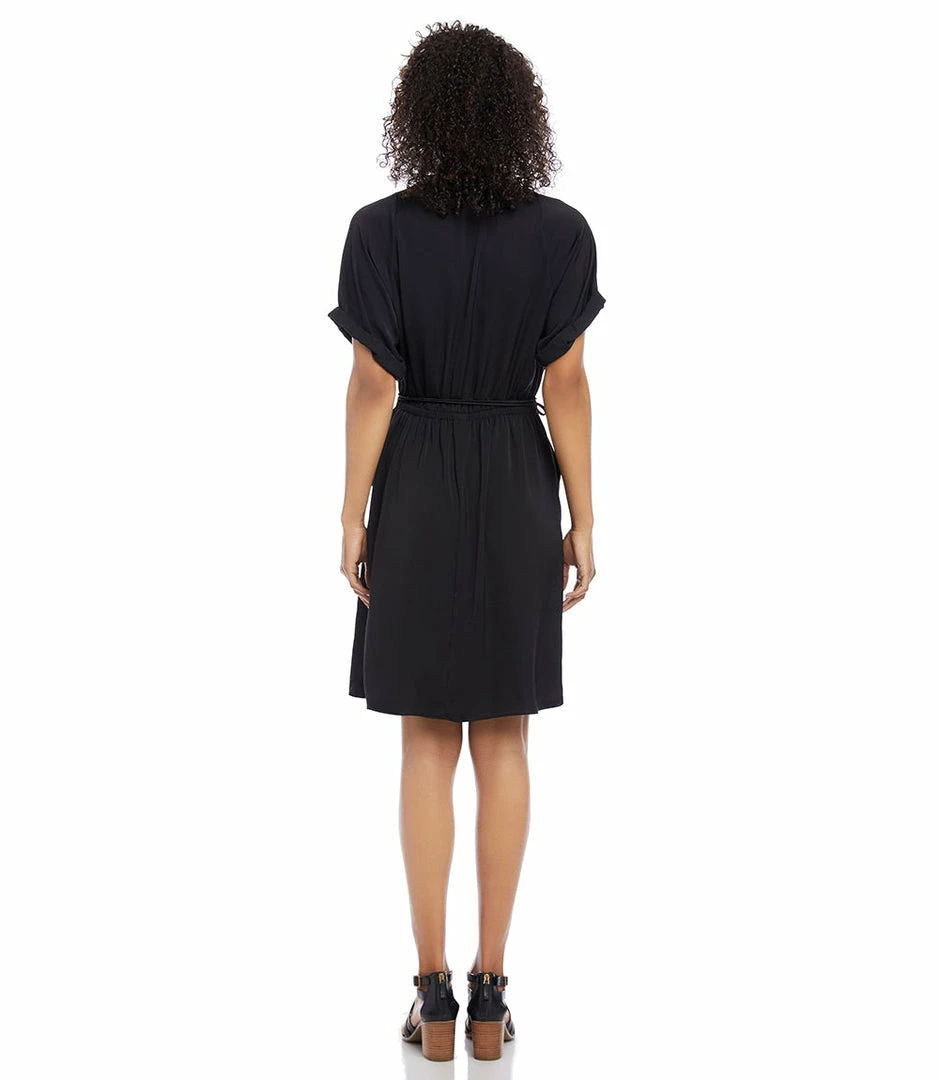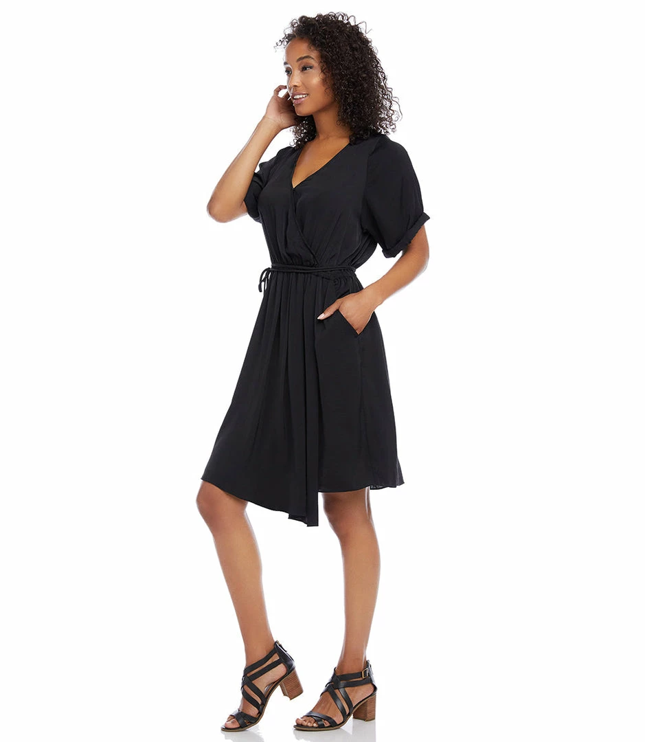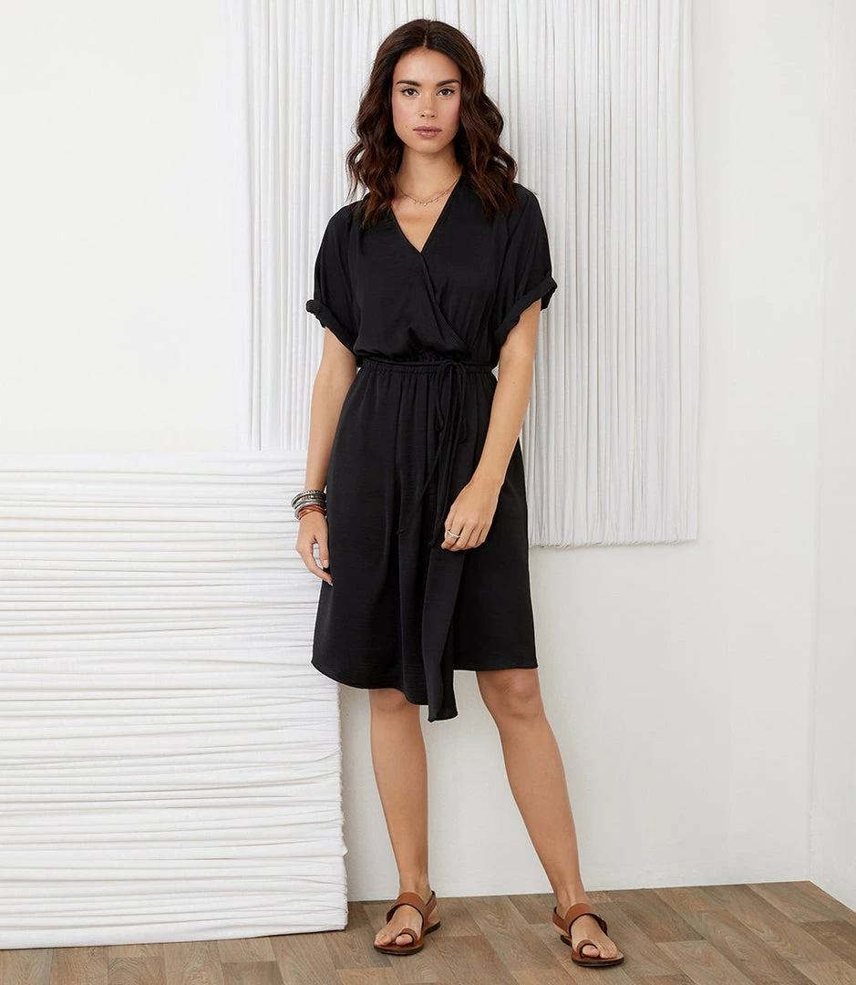 Cut from rich silky satin, this indulgently smooth dress can be worn for more casual days or it can be dressed up with accessories. It features extended roll sleeves, handy side pockets, and a flattering faux wrap silhouette. Ties cinch the waistline for a uniquely tailored look.