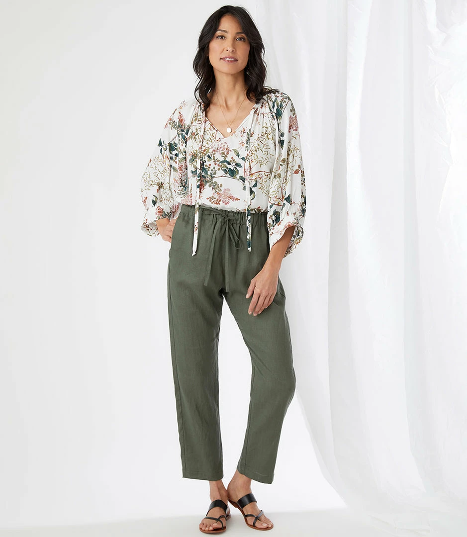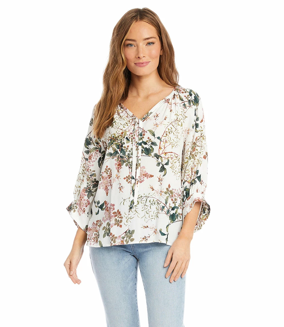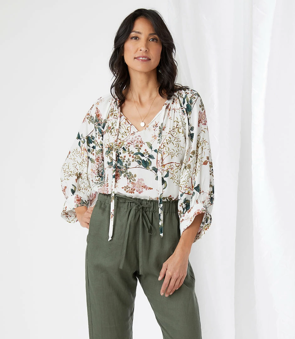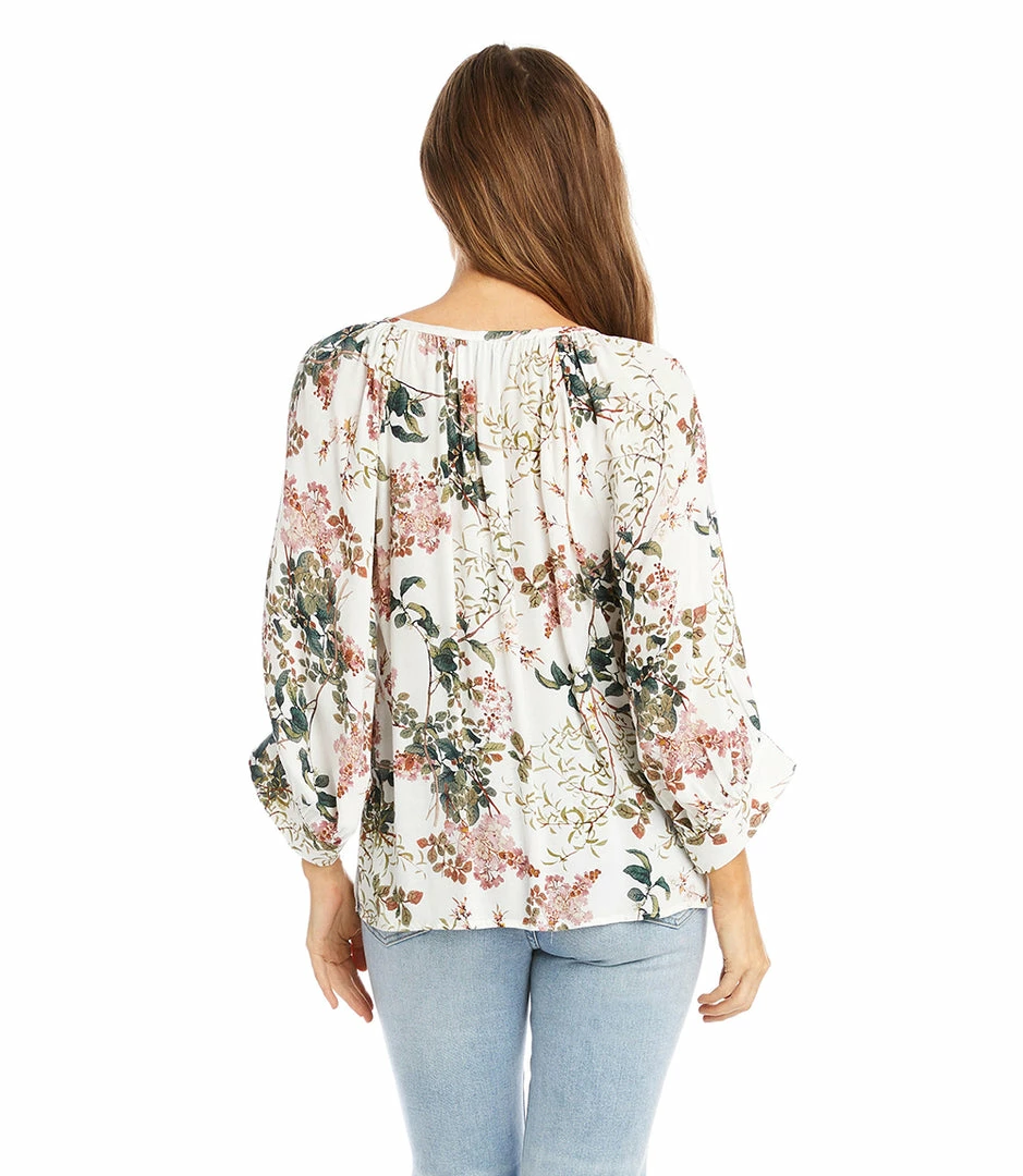 Designed to set a romantic tone, top features a retro floral print in soft shades of pink and olive. This comfortable blouse features billowy blouson sleeves and stylish ties at the neckline.