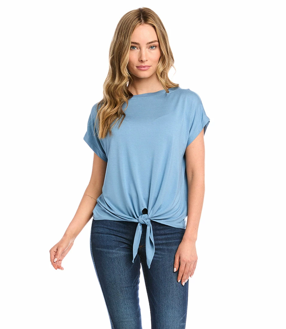 Cinched at the waist for a figure-flattering fit, this jersey-knit top features a sleek boat neckline, drop shoulder sleeves, and stylish tie-front.