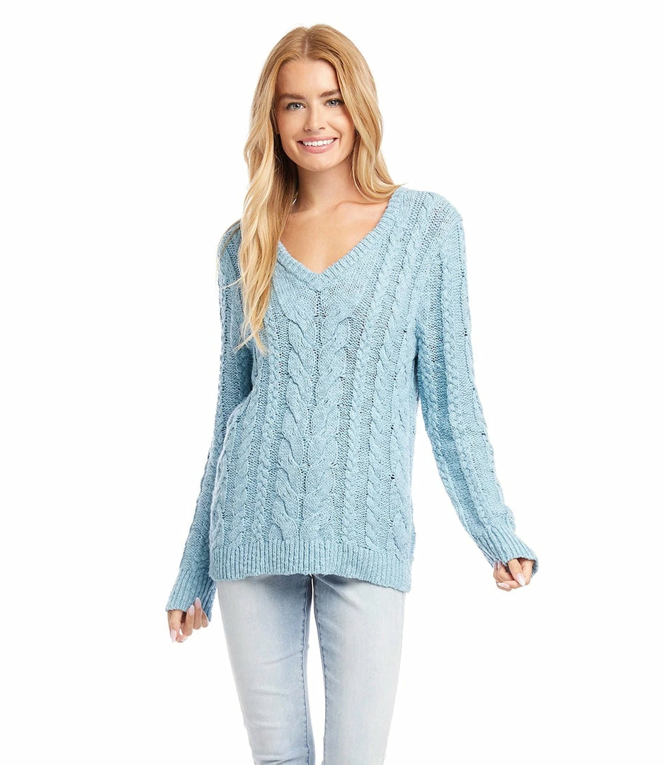 Richly textured yarns create a polished cable knit pattern over this pullover sweater that is sure to become a wardrobe essential.