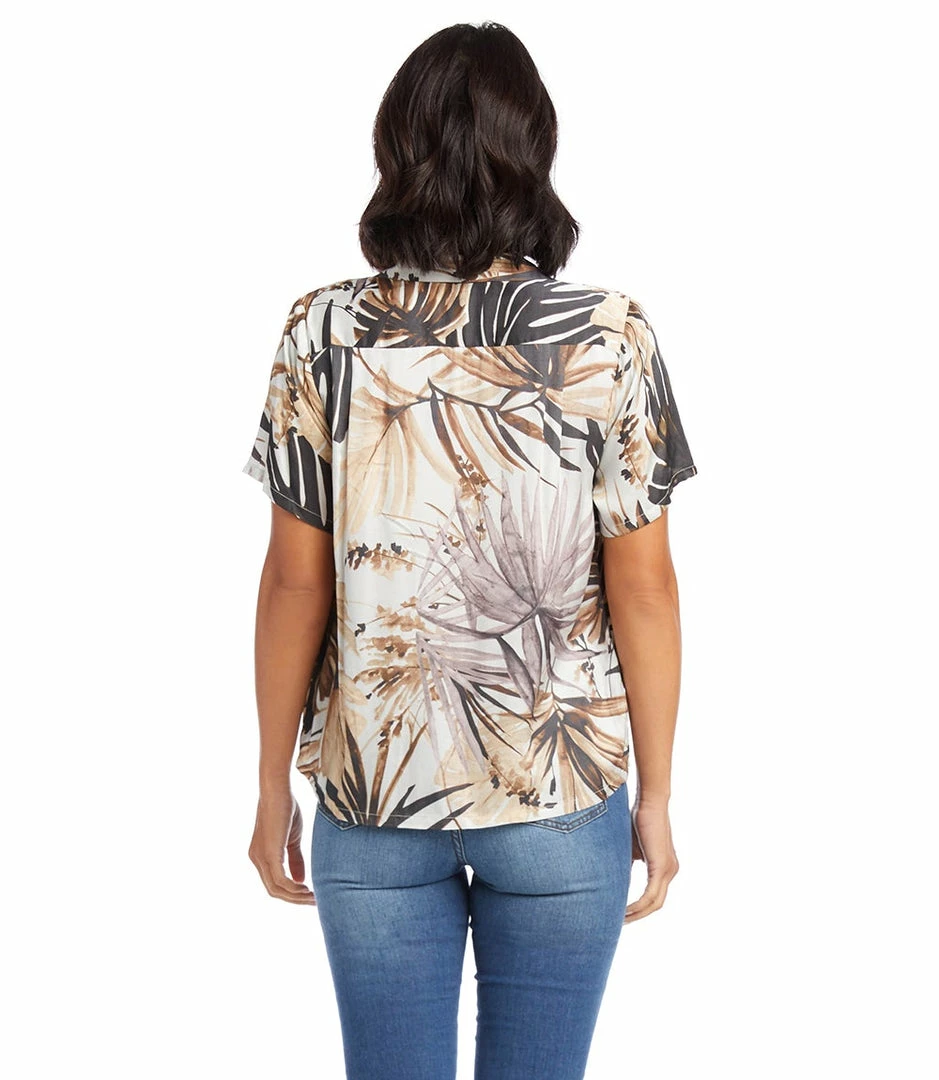 A tropical print details this easy-to-wear top accented with a notched collar and a relaxed silhouette.