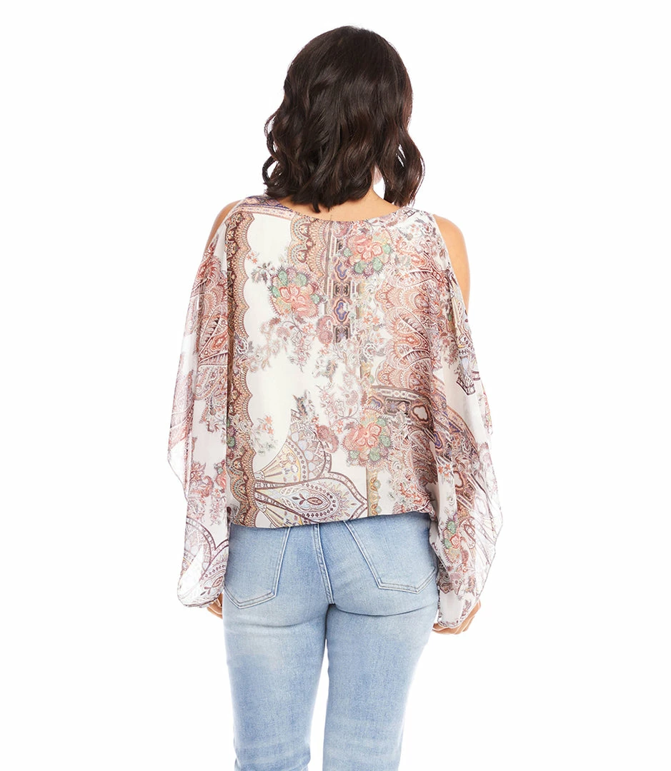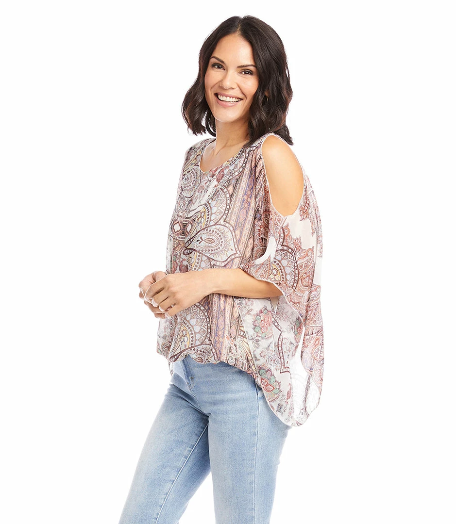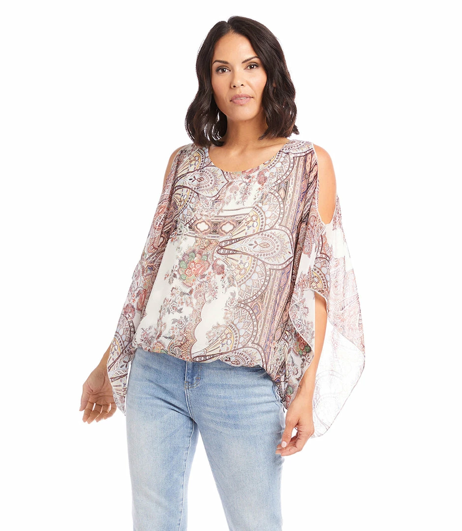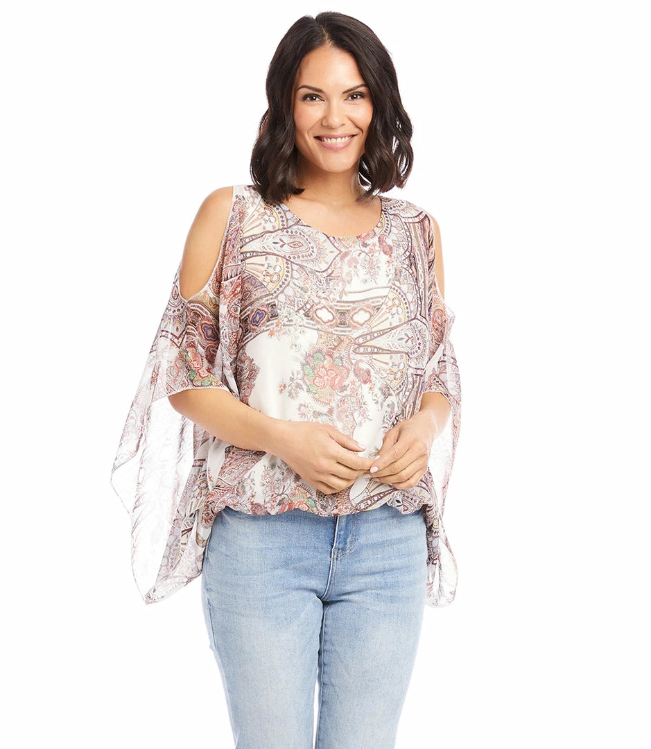 A breezy top with a softly wandering paisley print. This dreamy top features a flattering silhouette with an elastic bottom and built-in jersey knit lining.