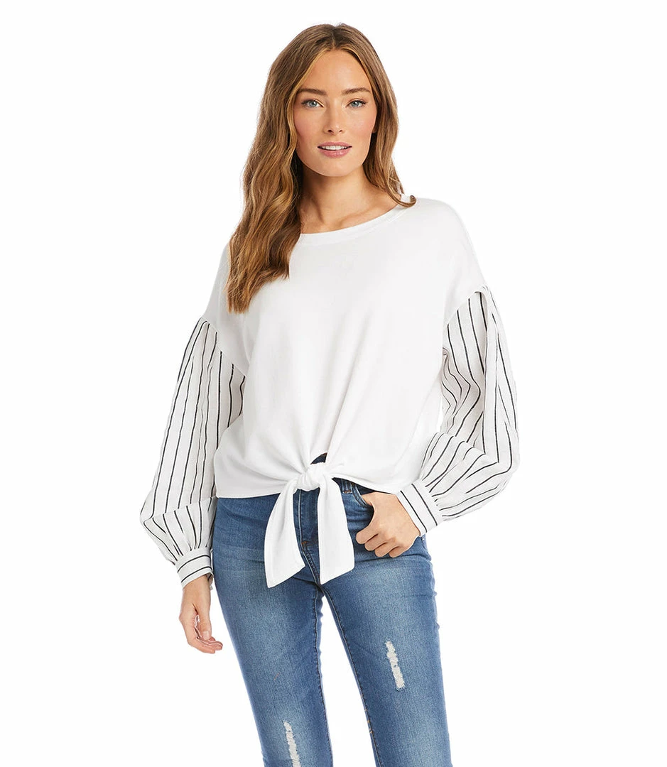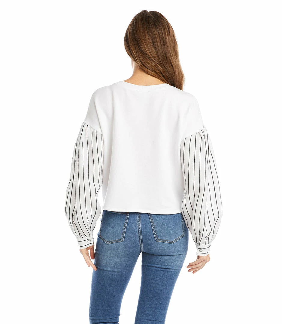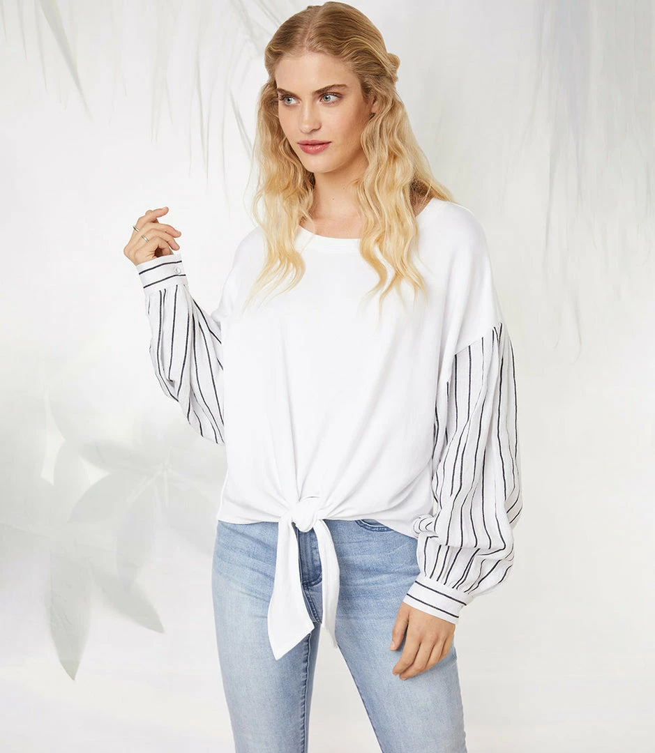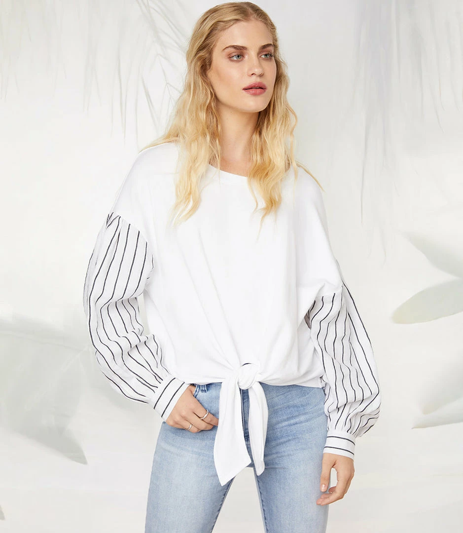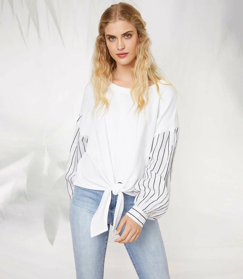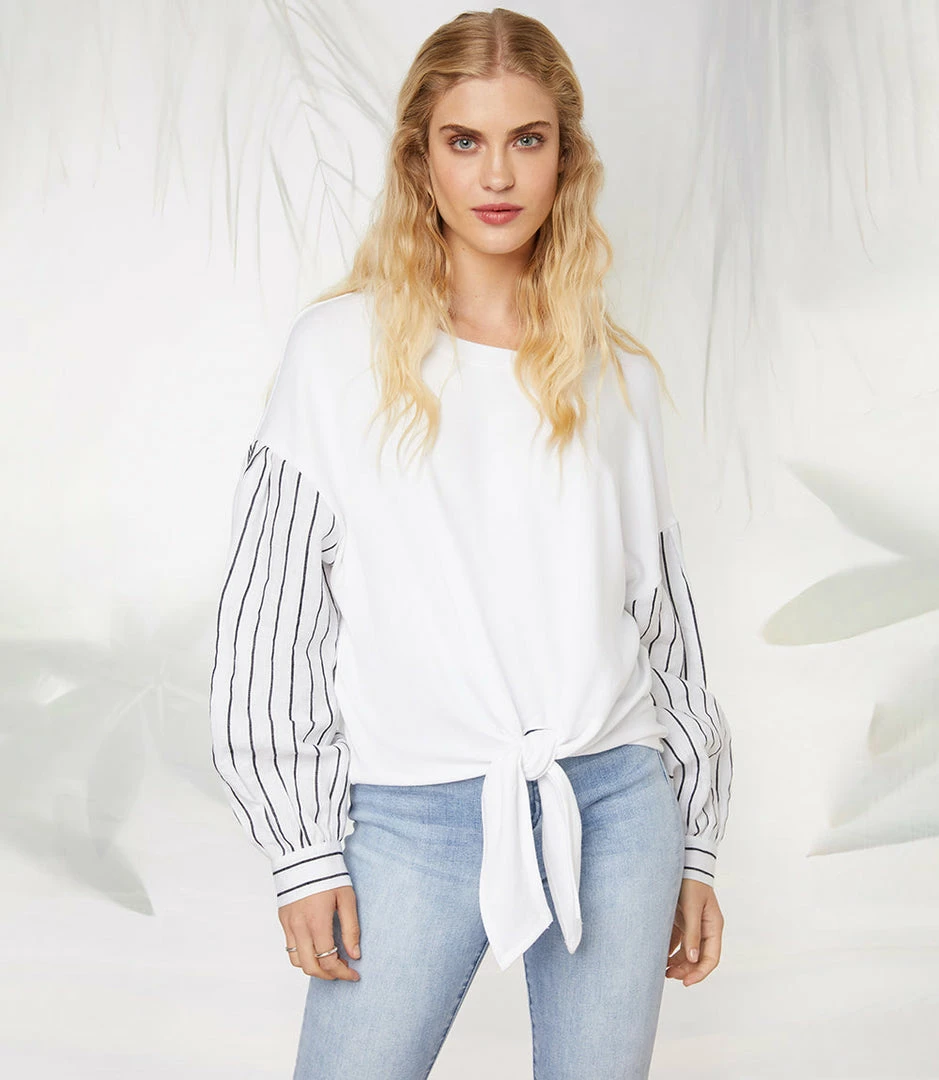 An essential fleece pullover is updated with polished mix-striped sleeves. Contrasting sleeves add a sophisticated element.