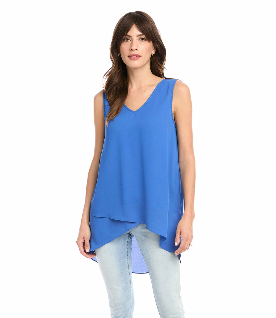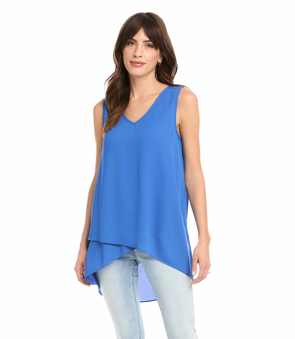 Breeze through summer in style with this silky crepe tank. The sleeveless v-neck silhouette falls into a crossover front that dips into a lower back hem.