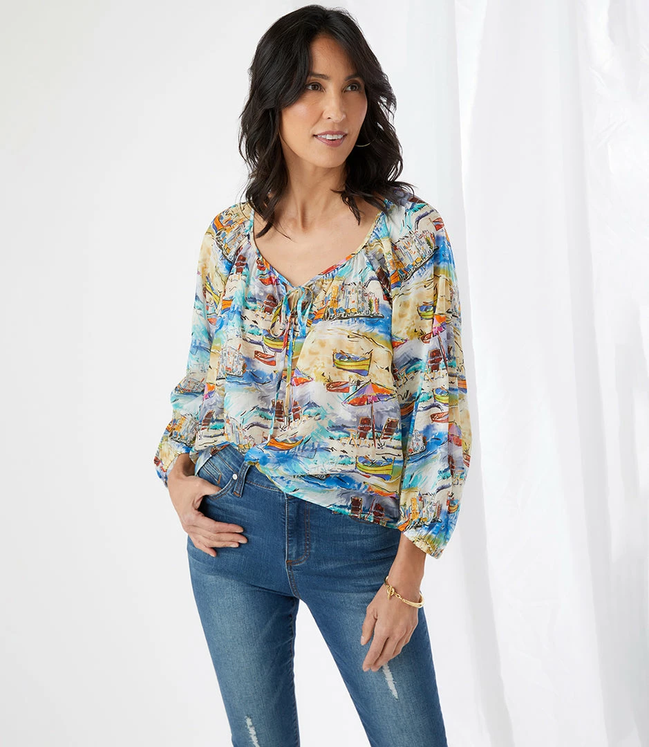 Inspired by a seaside getaway, this breezy peasant top is decorated with a colorful beach scene. Pair it with high-waisted jeans or tailored shorts—its outfit possibilities are endless.