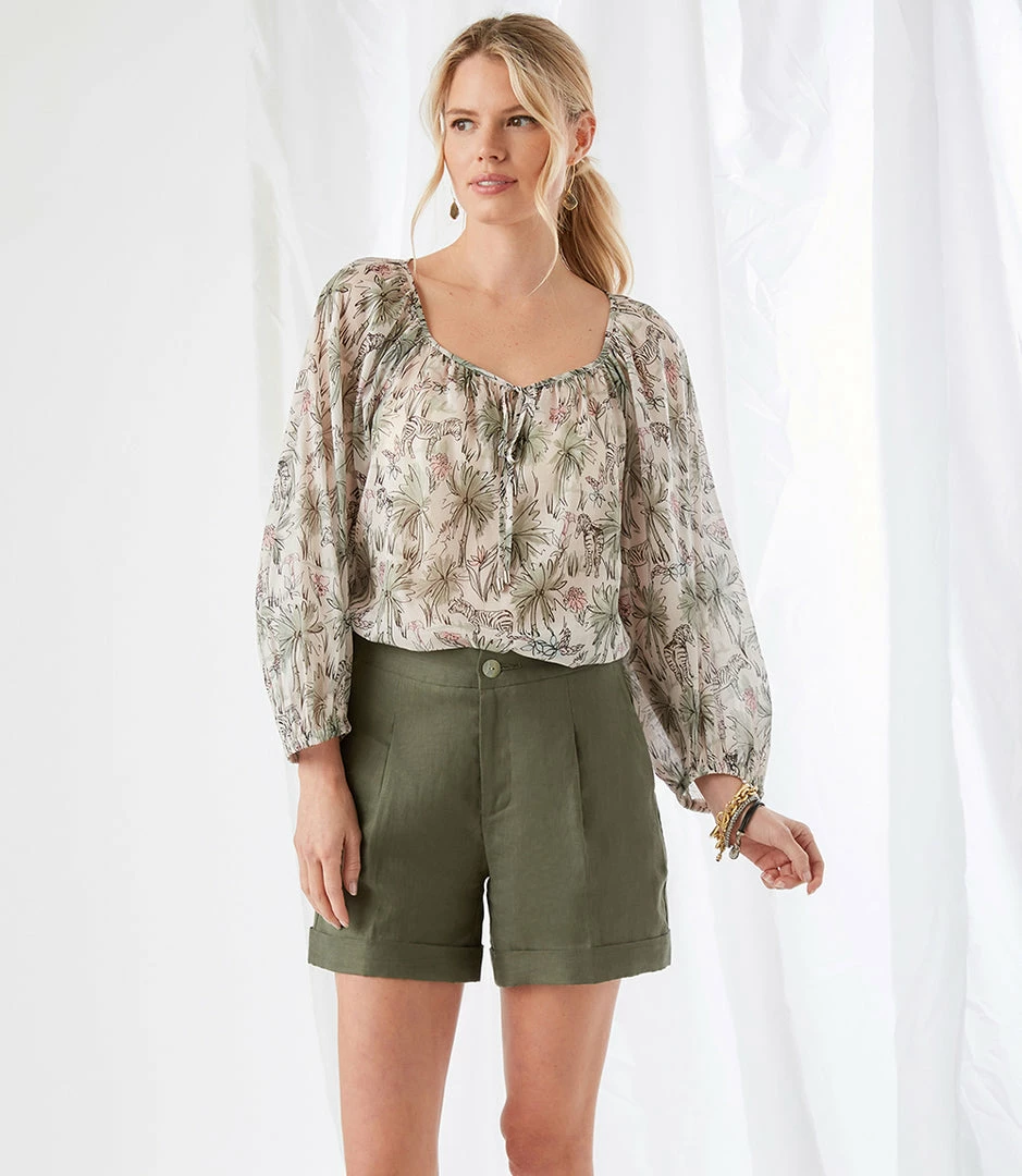 A breezy blouse, finished with a illustrated zebra print in a soft palette of pastel shades. It pairs perfectly with your favorite denim.