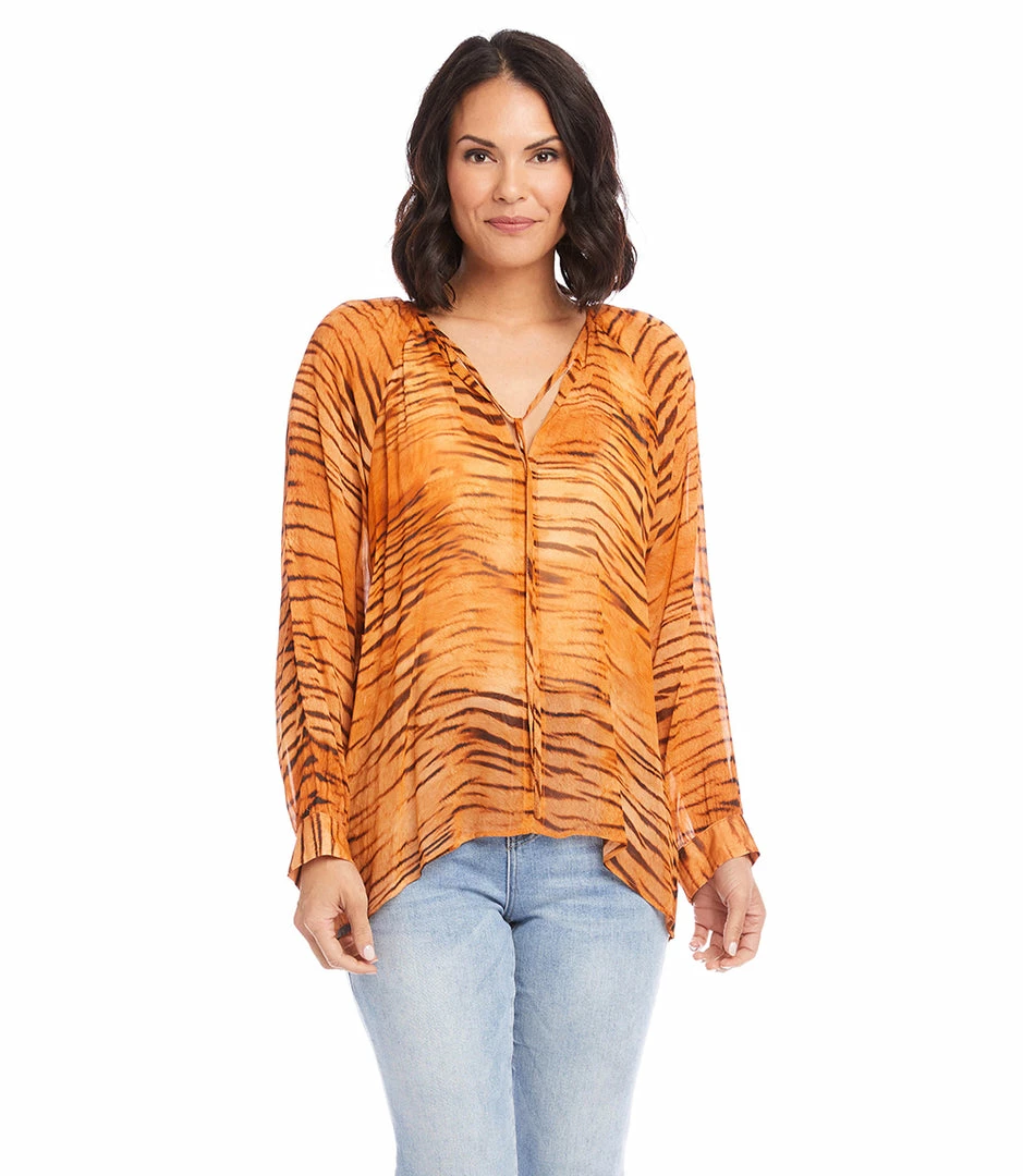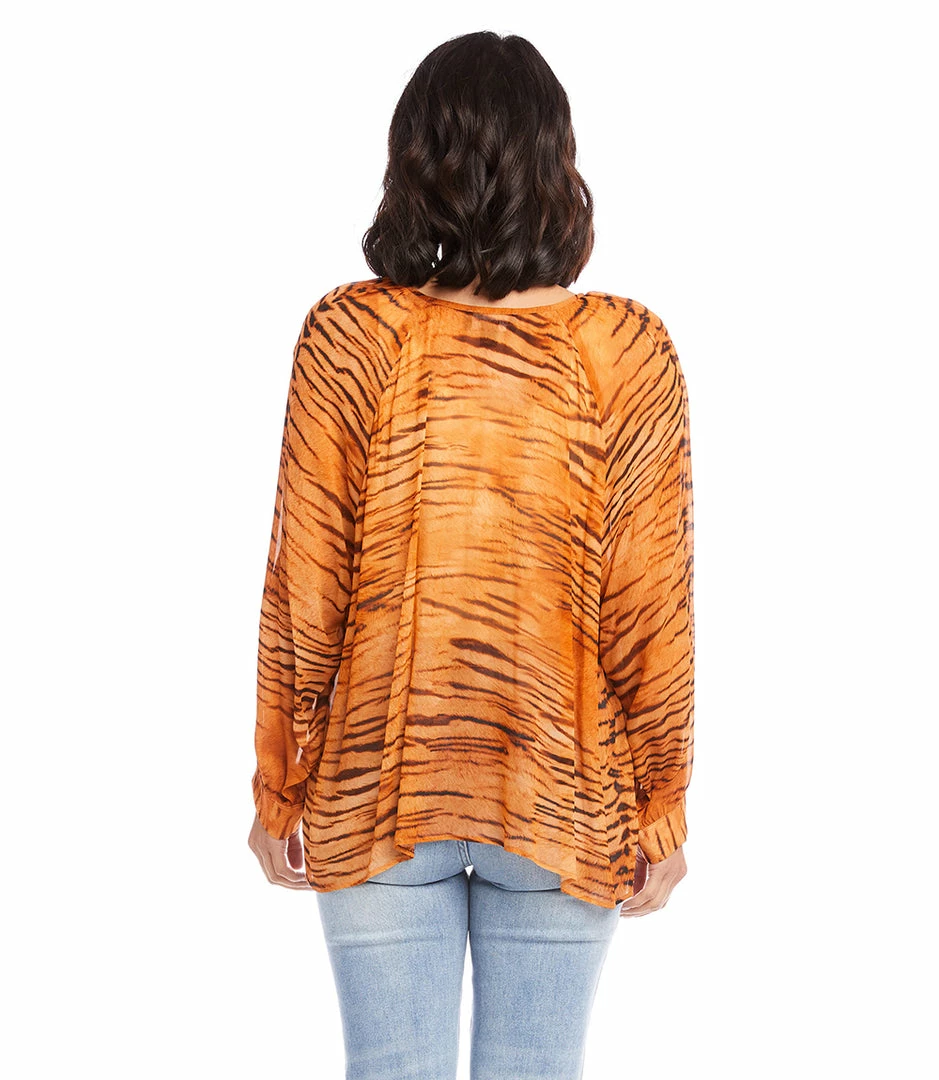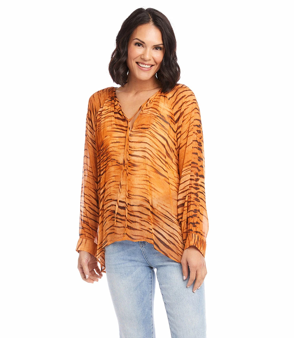 Designed to set a fierce tone, this airy top covered in a bold tiger print is detailed with billowy sleeves and ties at the neckline.