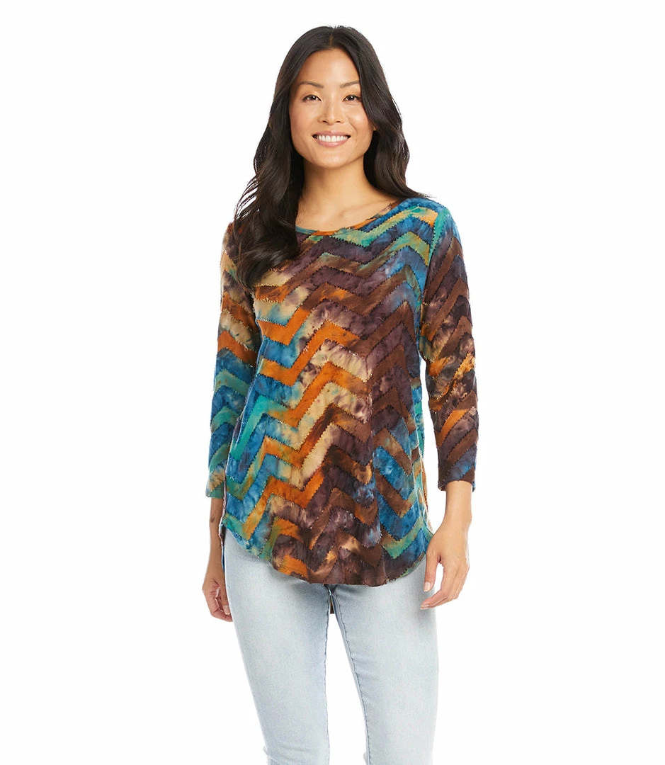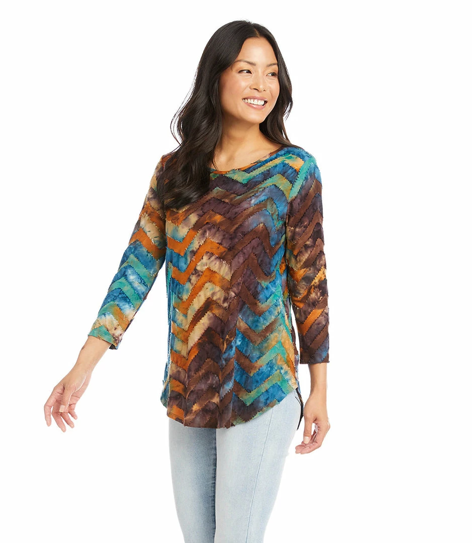 Textural beauty is found in this jacquard top covered in an alluring chevron tie-dye design. It pairs perfectly with your favorite denim.