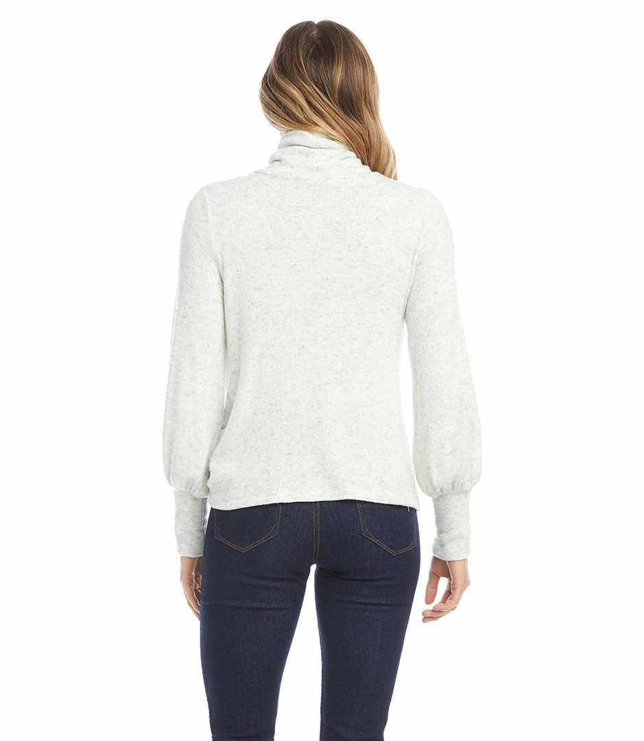 Cut from buttery soft rib knit, this timeless turtleneck top is refreshed with a stylish pick-up hem. It’s finished with billowy blouson sleeves.