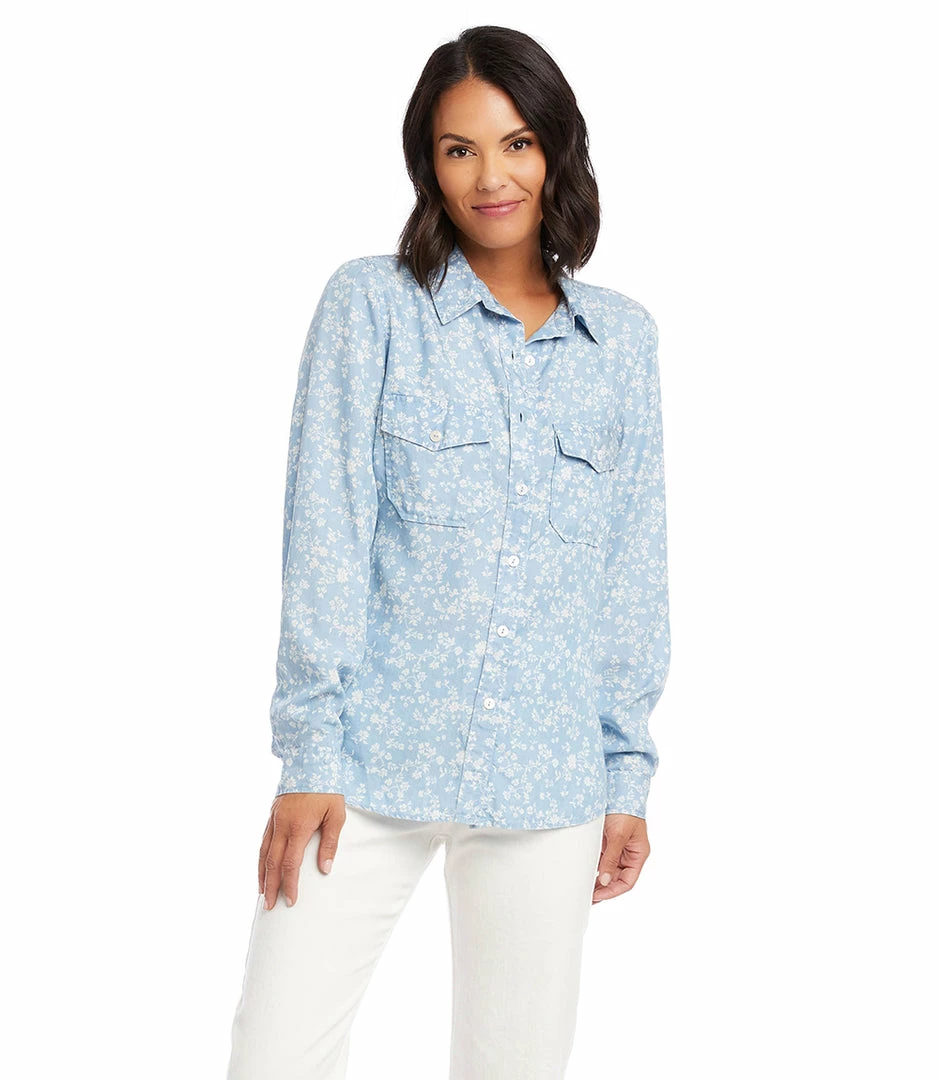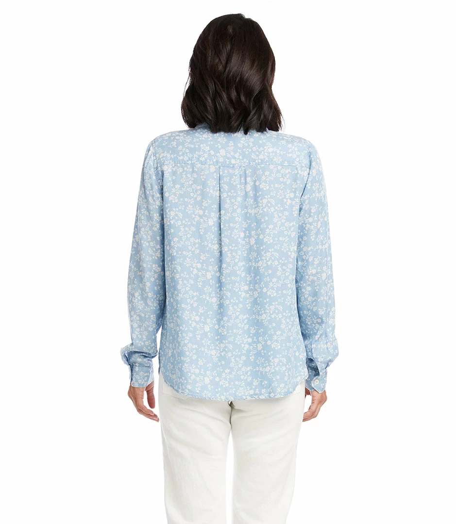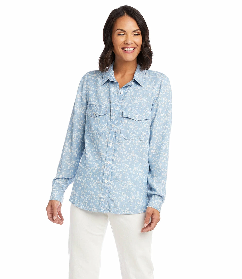 Set an all-around romantic tone with this chambray shirt detailed with a charming floral print.