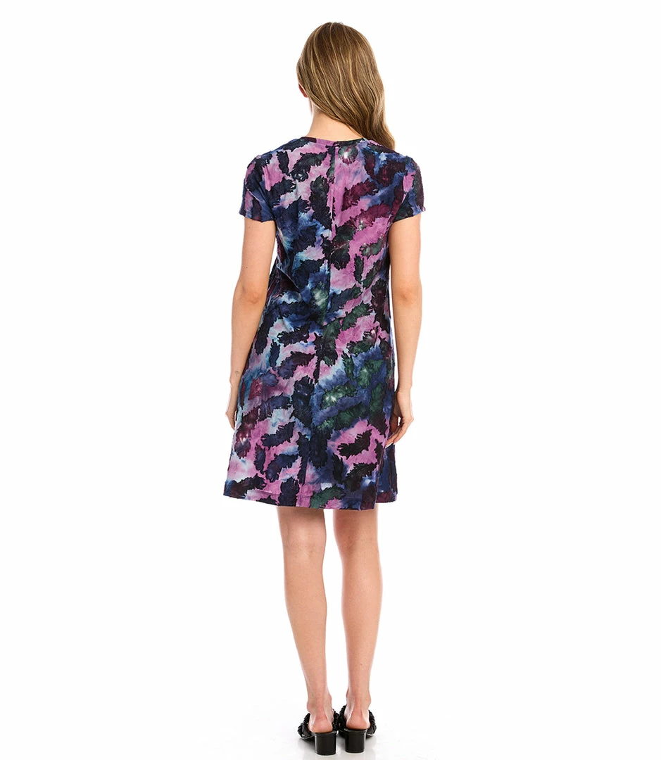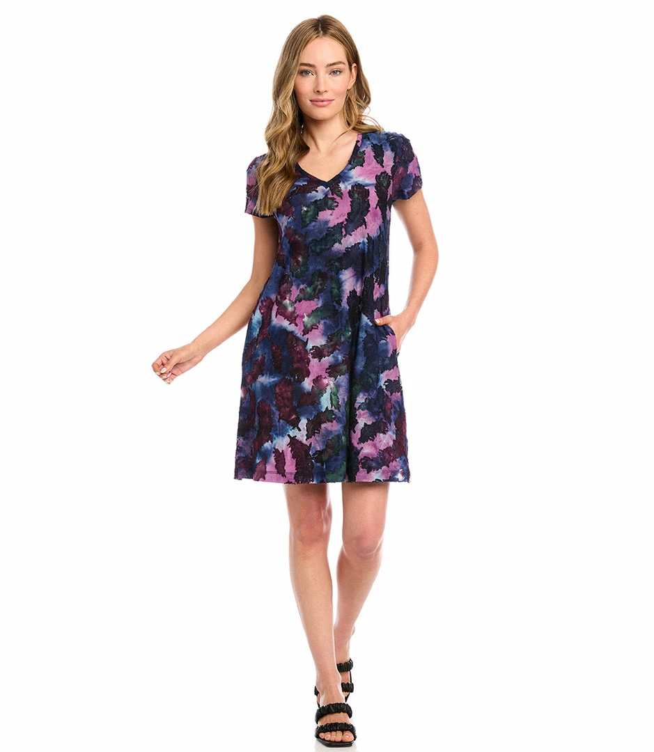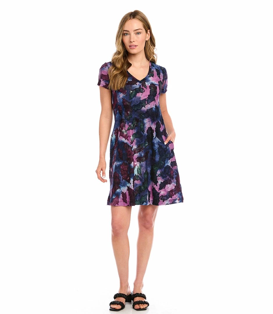 Textural beauty is found in this jacquard dress covered in an alluring feathered tie-dye design. It also features handy pockets.