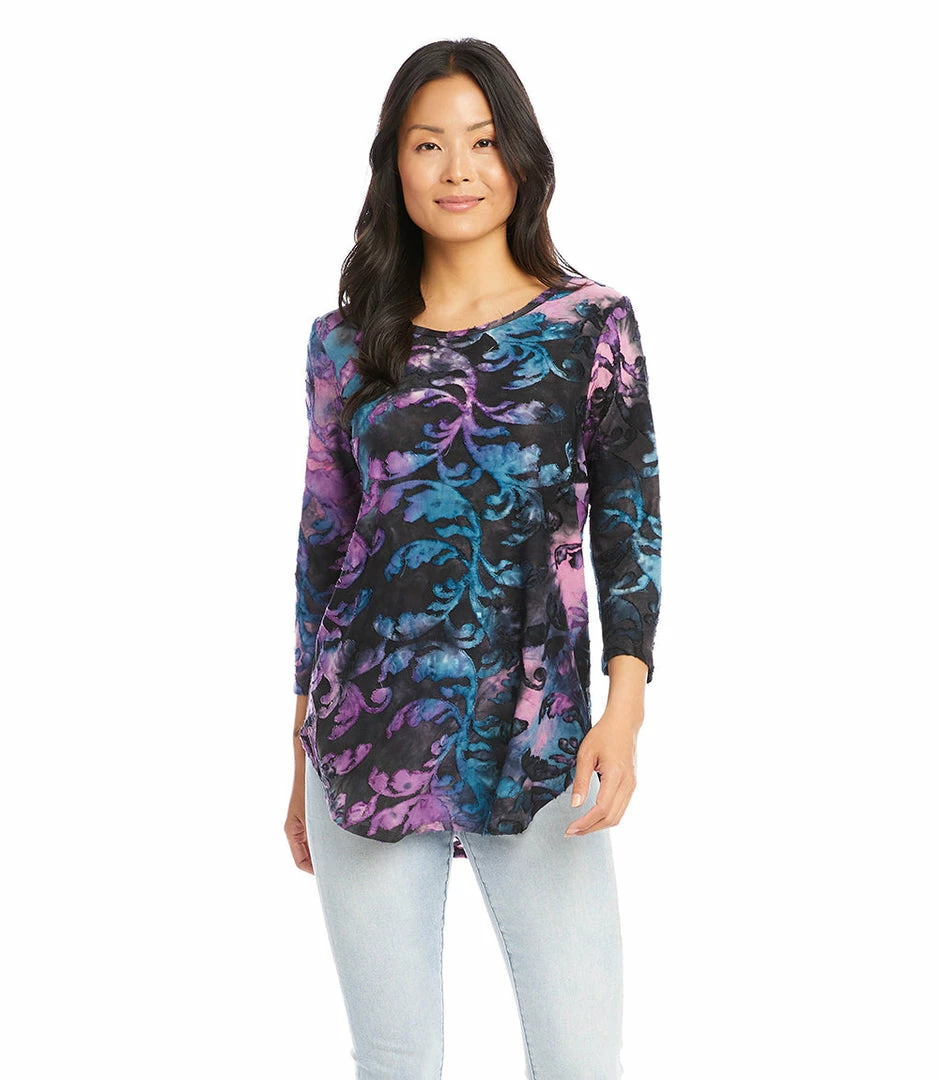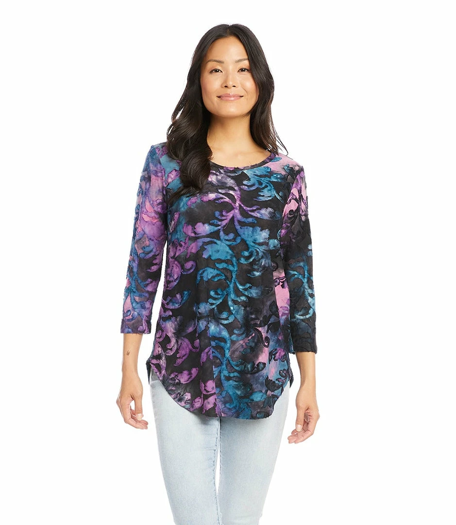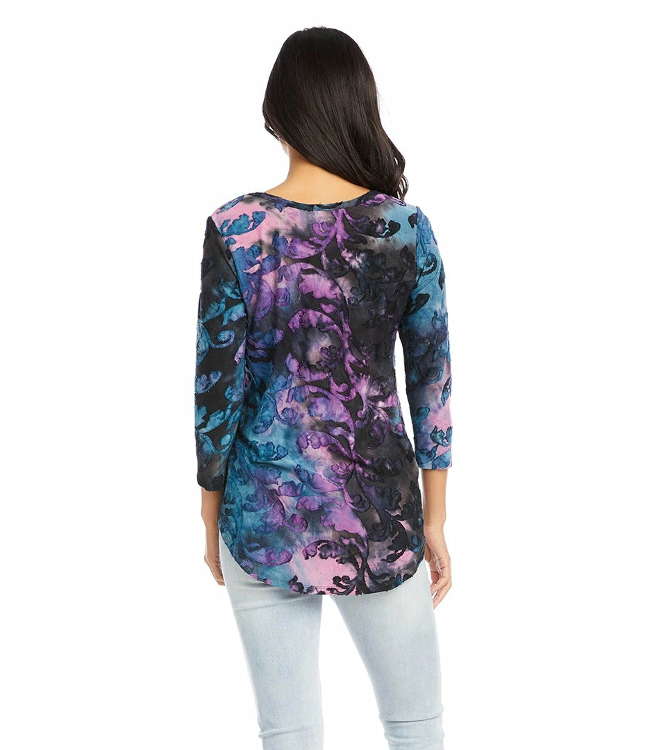 Textural beauty is found in this jacquard top covered in an alluring baroque tie-dye design. It pairs perfectly with your favorite denim.