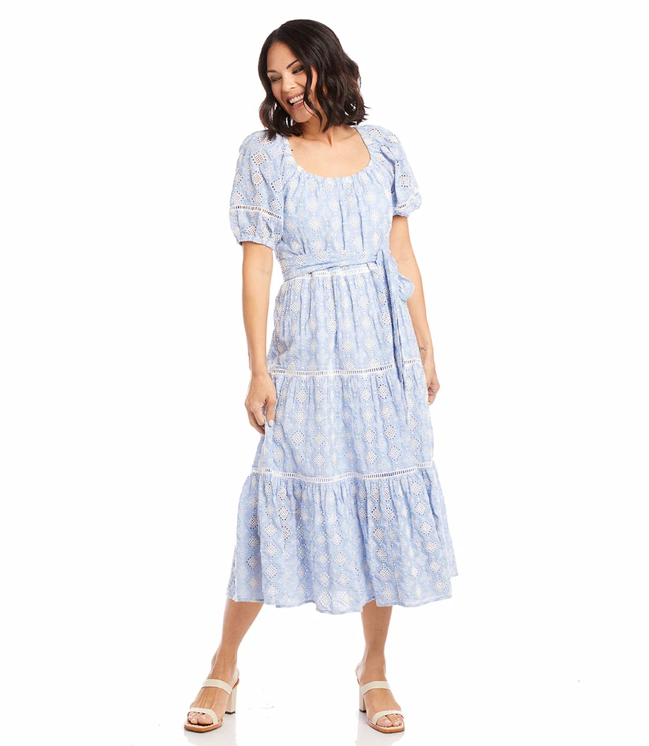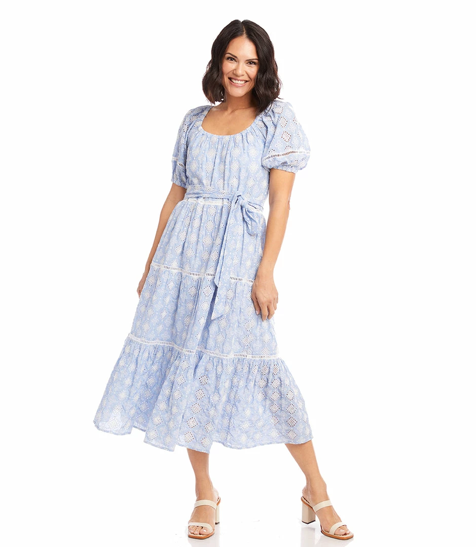 Embroidered eyelet lace embodies the essence of sunny days. Coming in airy embroidered eyelet lace, this midi dress features puffed sleeves and an elegant tiered hem. It also features a flattering cinched waist and matching belt.
