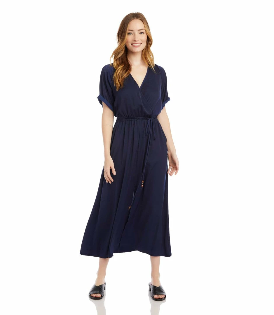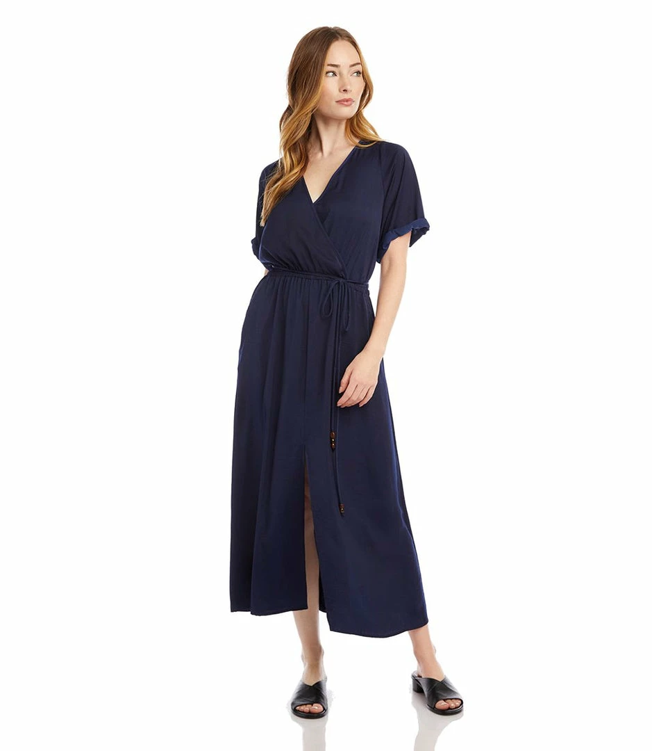 Indulgently smooth, this breezy dress features extended roll sleeves and a front-slit hem. Cinched at the waist for a uniquely tailored look. Belted tie includes wood and resin tiger’s eye beads.