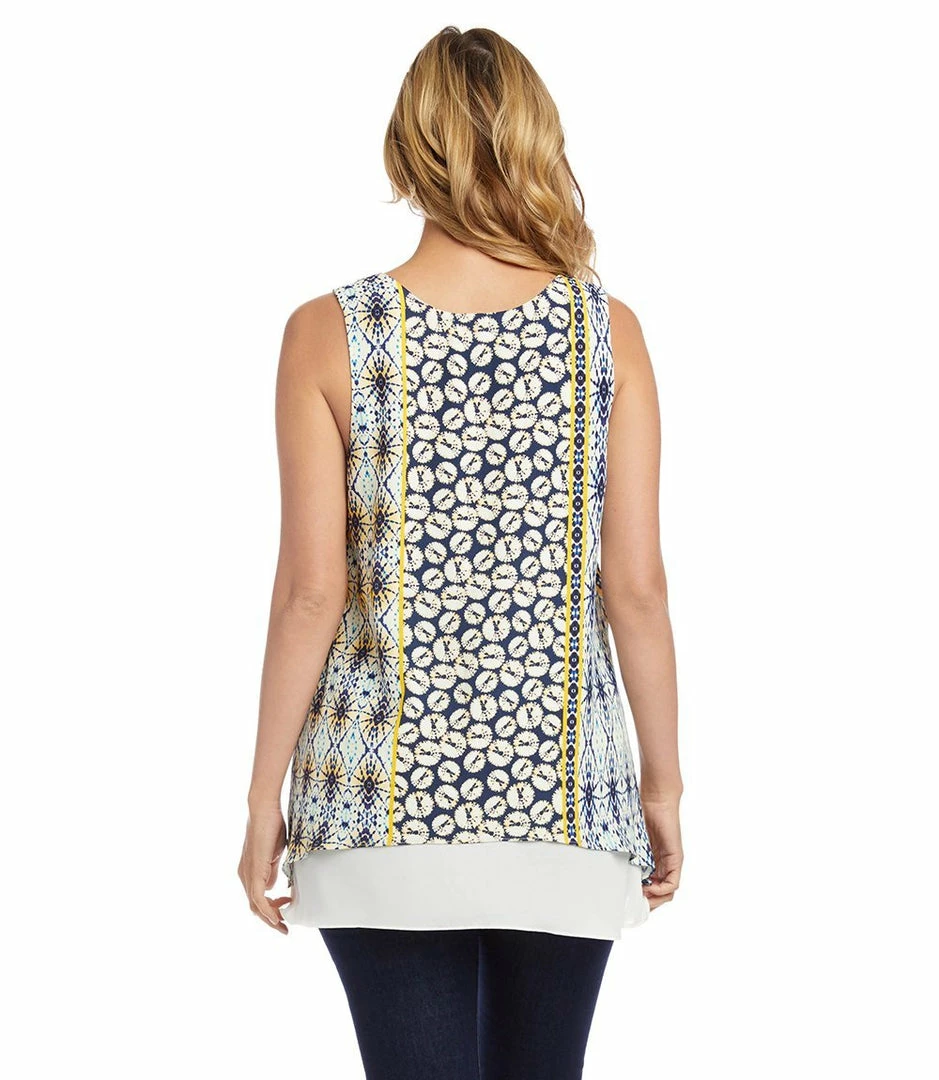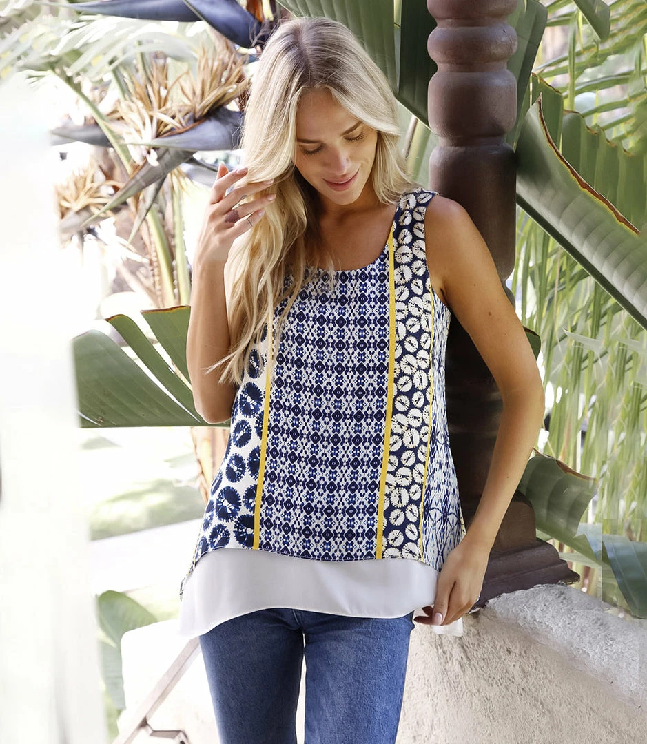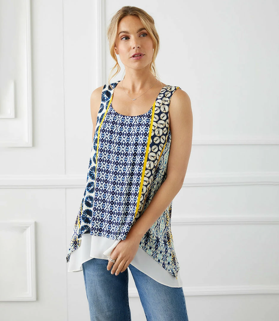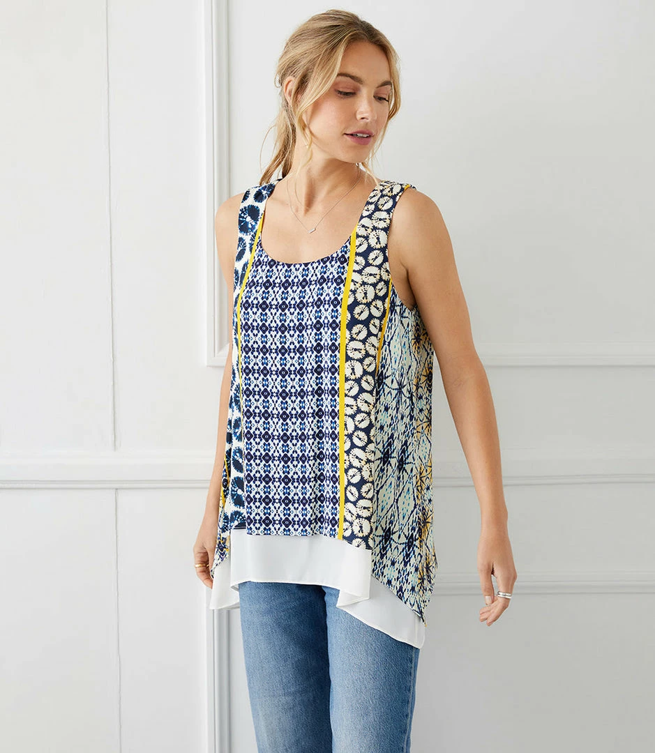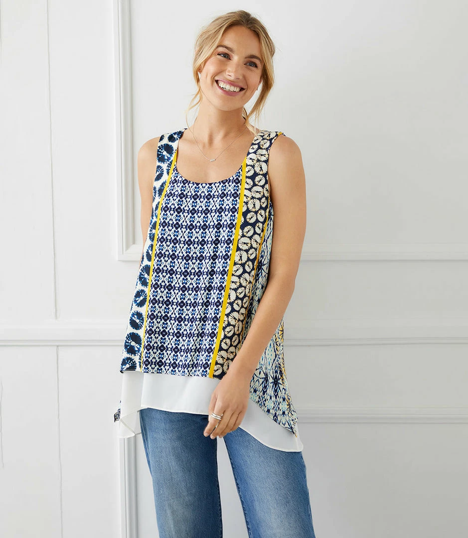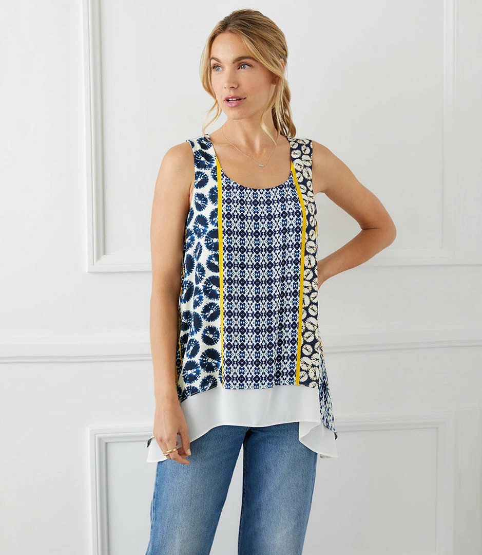A double layered front descends into a handkerchief hem bringing stylish dimension to a breezy crepe tank.