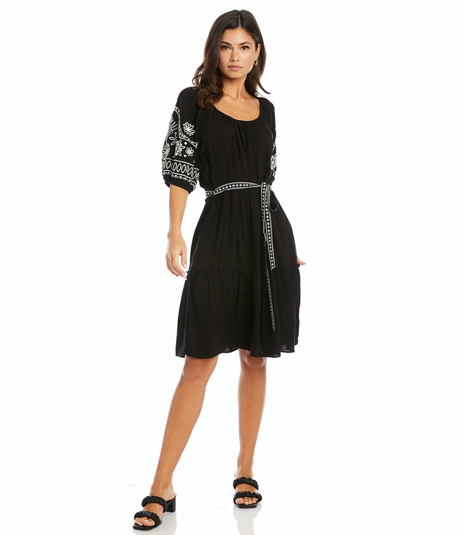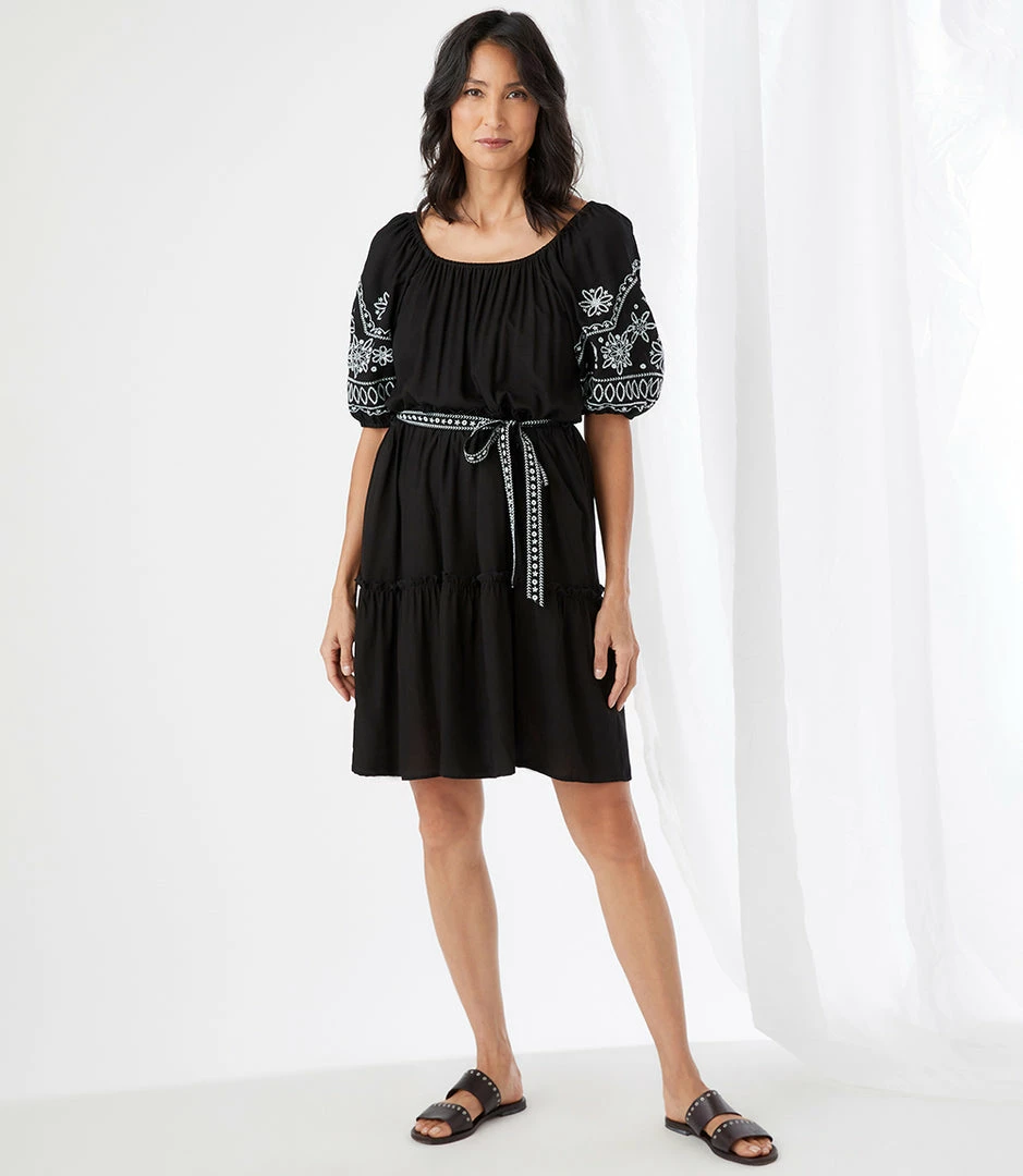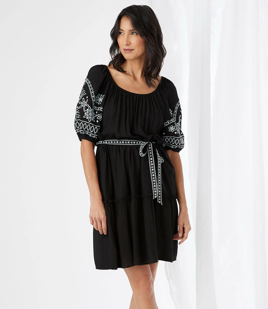 Crafted from biodegradable rayon, this elegant style is equal parts chic and comfortable, with intricate embroidery on the sleeves and belt. The generous shape is easy to wear- short sleeves and a shirred neckline give it a wear anytime feel.