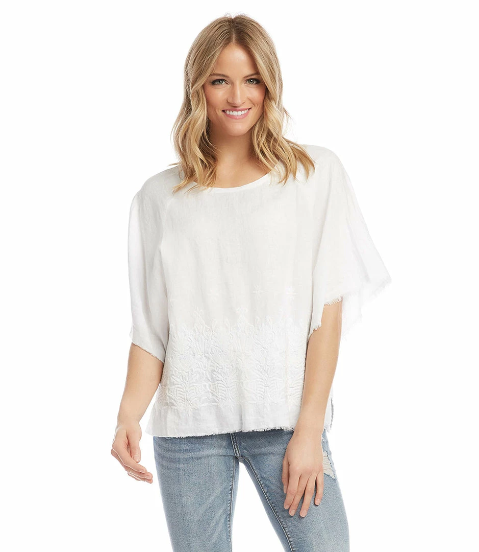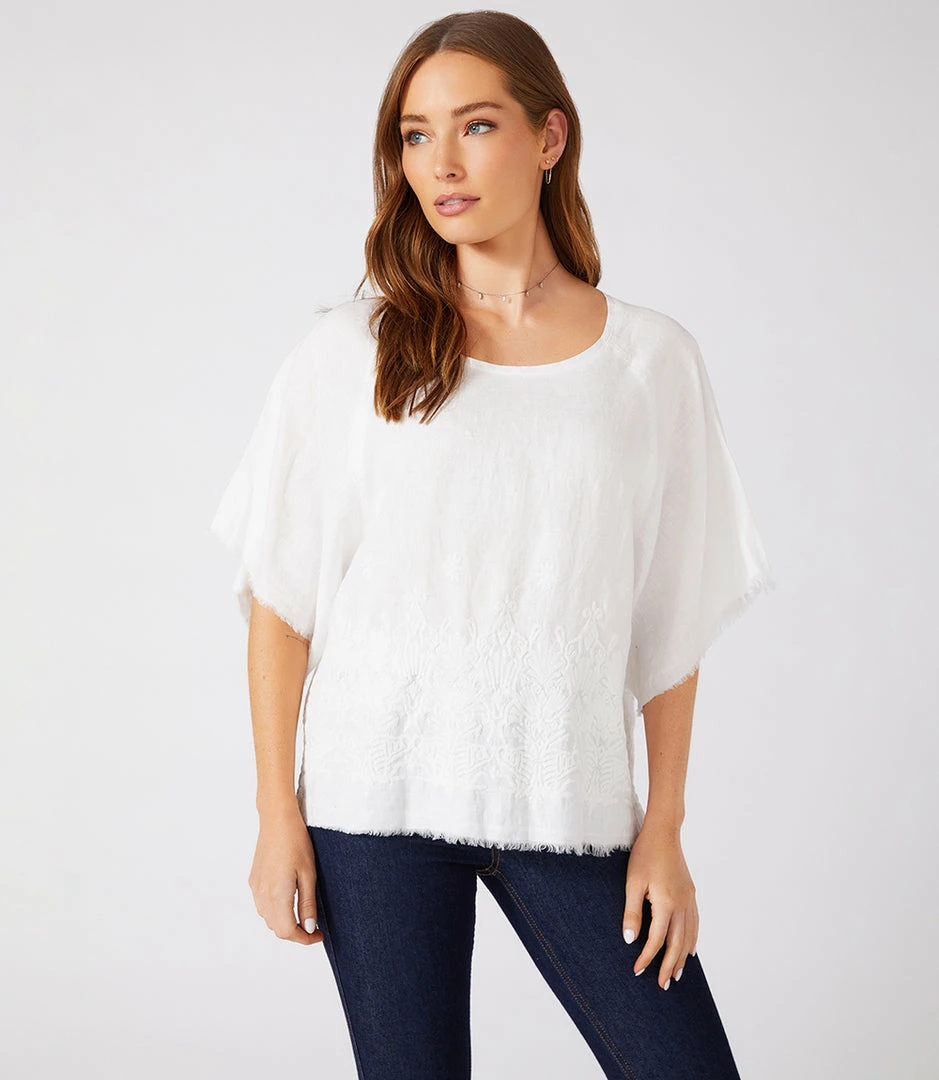 Designed to set a romantic tone, this breezy linen top features a delicate lace inset for an airy finish.