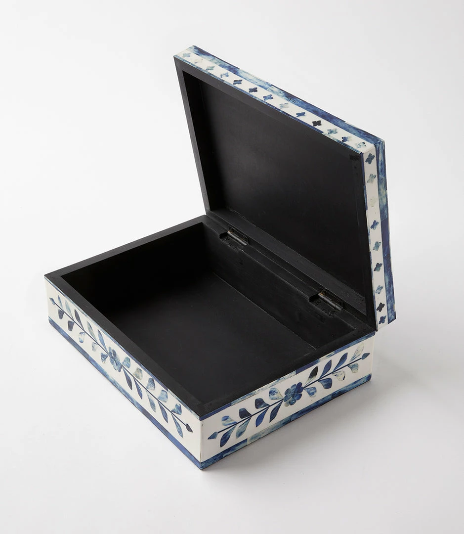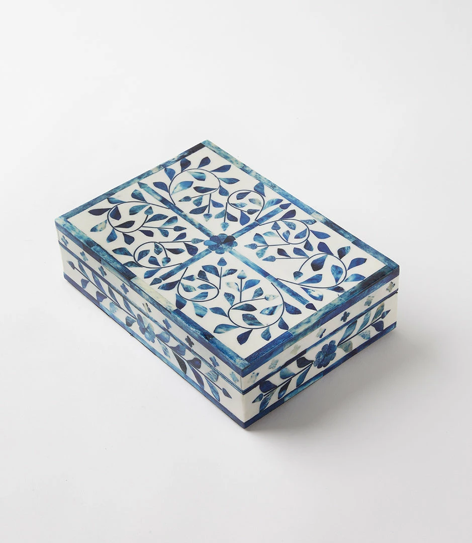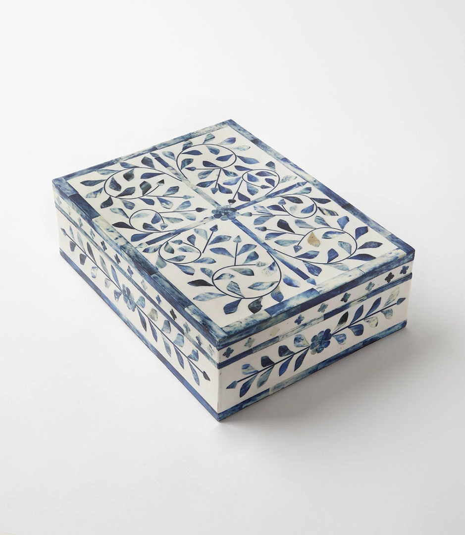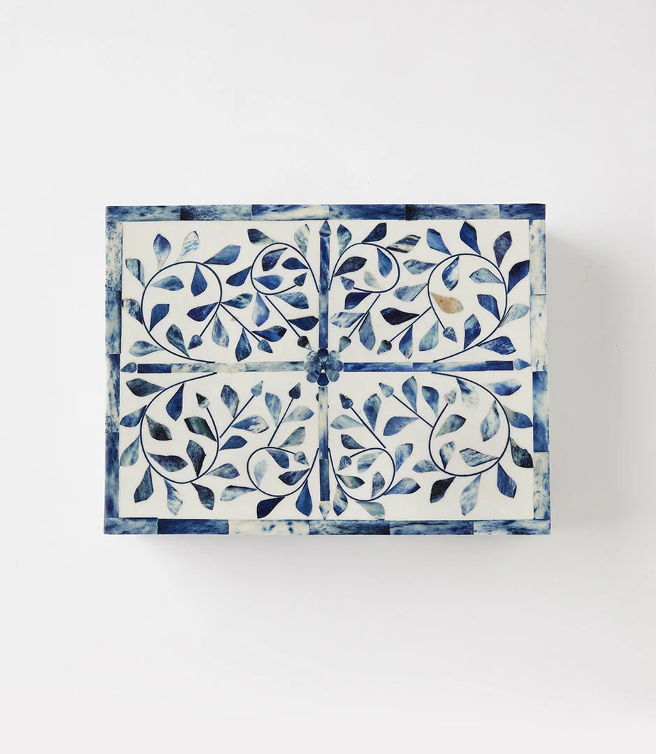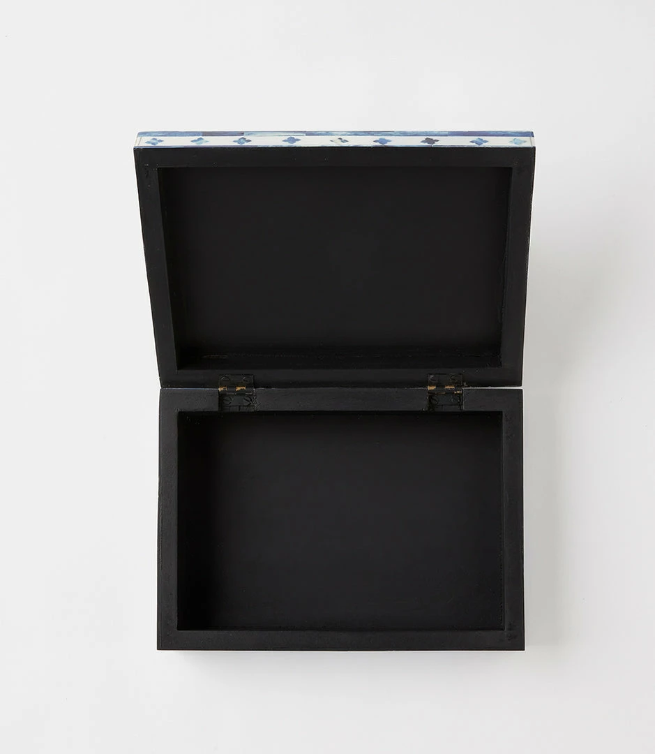 Handcrafted by artisans, these boxes are composed of bone. It features intricately laid mosaic pieces to create a stunning geometric design. These boxes are perfect for storing jewelry or any special items. Due to the natural characteristics of this item, each piece will have variances, no two are the same.