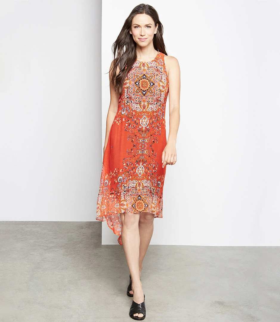 Escape to tropical paradise with this breezy hi-lo dress. It features an airy sheer overlay, covered in a vibrant scarf print.