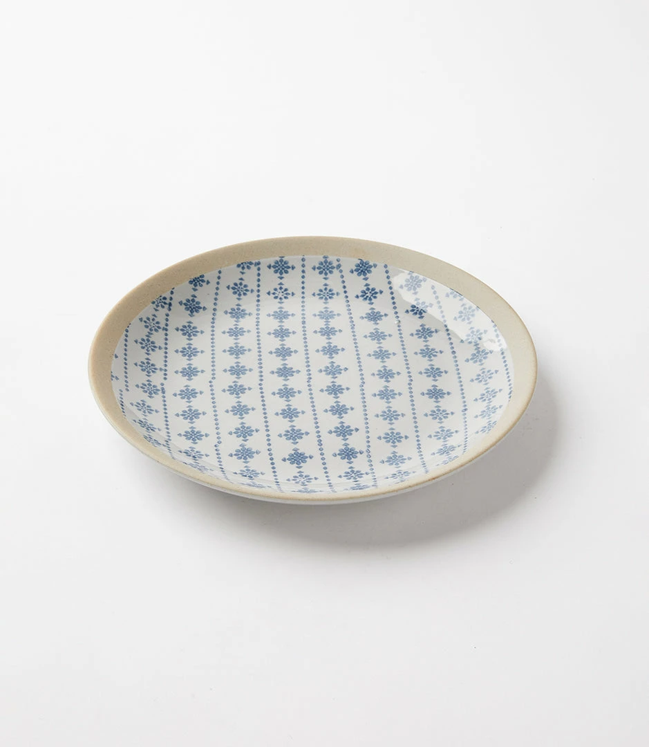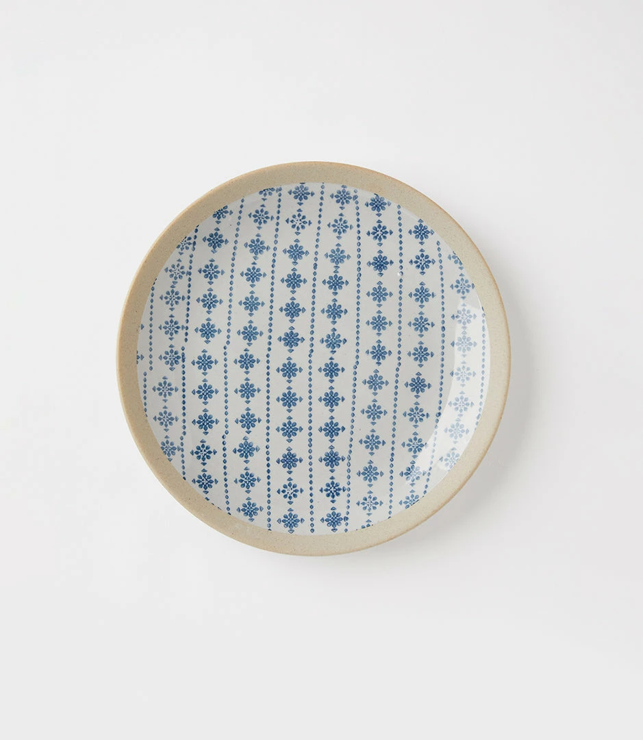 A beautifully glazed plate adorned with blue and white motifs. Available in four designs: daisy, floral, geometric, and ikat. Perfect for dinner al fresco, picnics, and meals shared with friends and family.