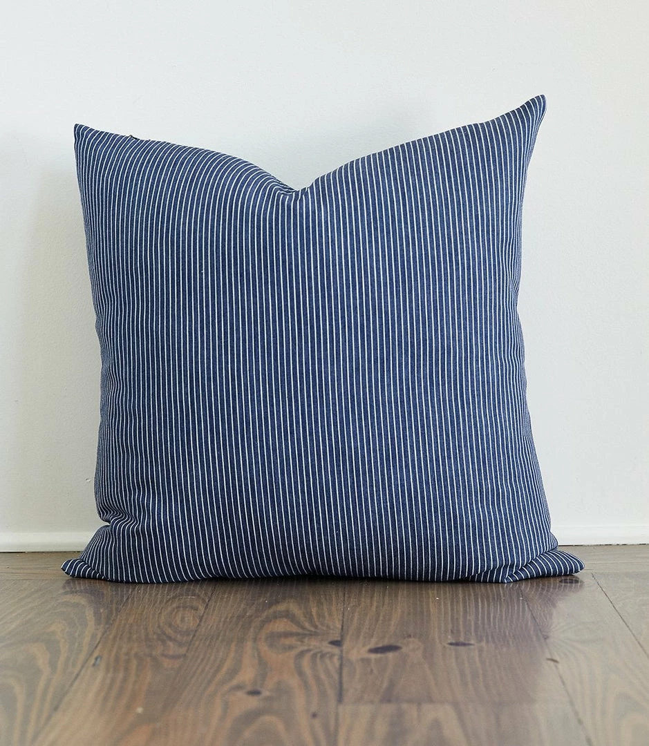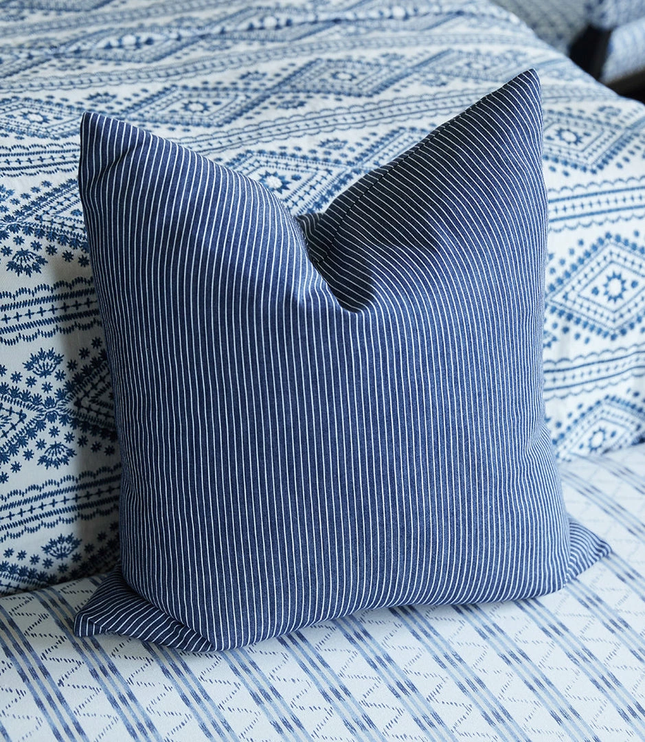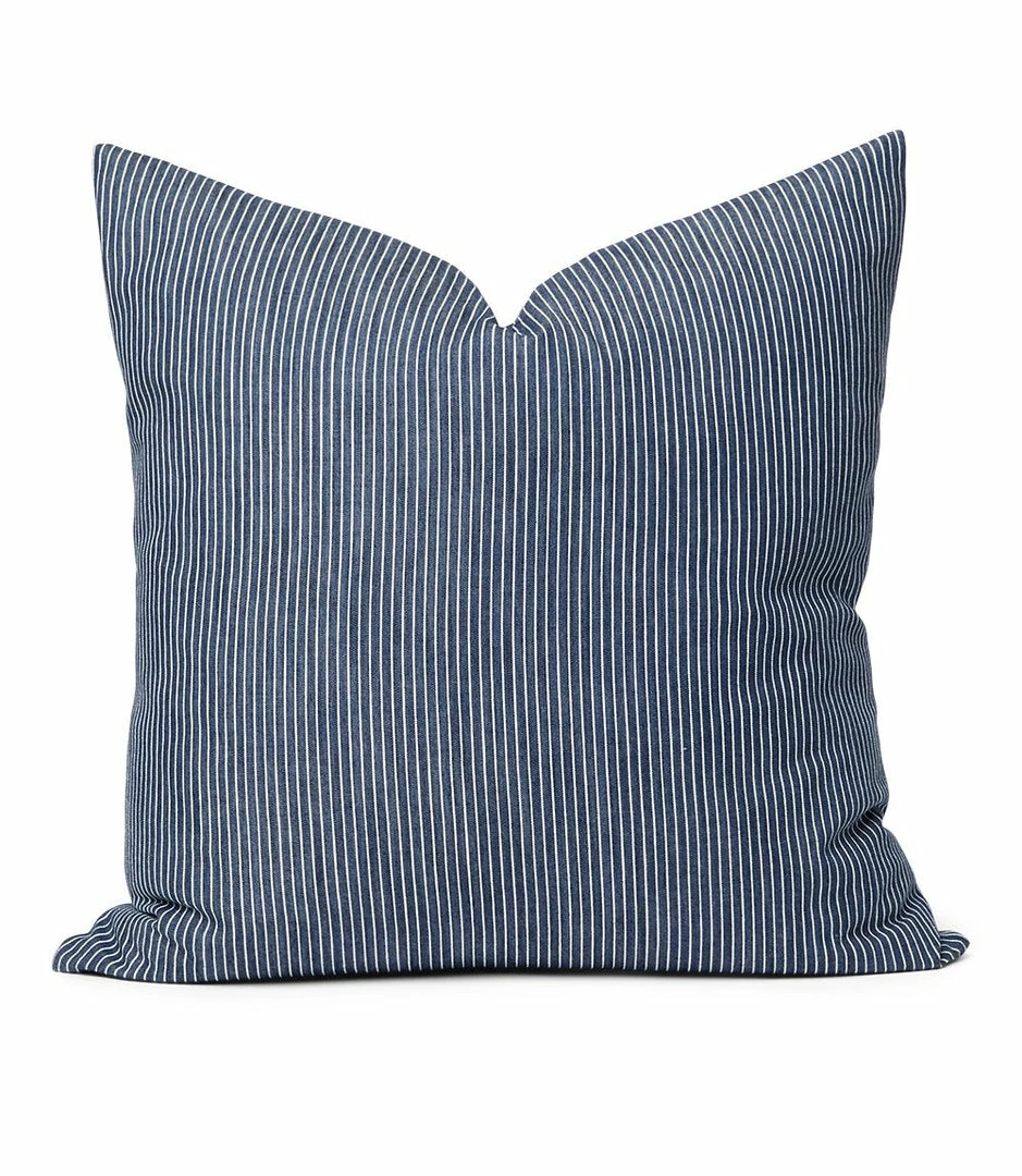 Mixed-scale stripes add a nautical-inspired element to this cotton denim pillow. Its striped pattern and timeless look make for a versatile pillow that can be easily layered with plain pillows. Includes pillow cover and feather insert.