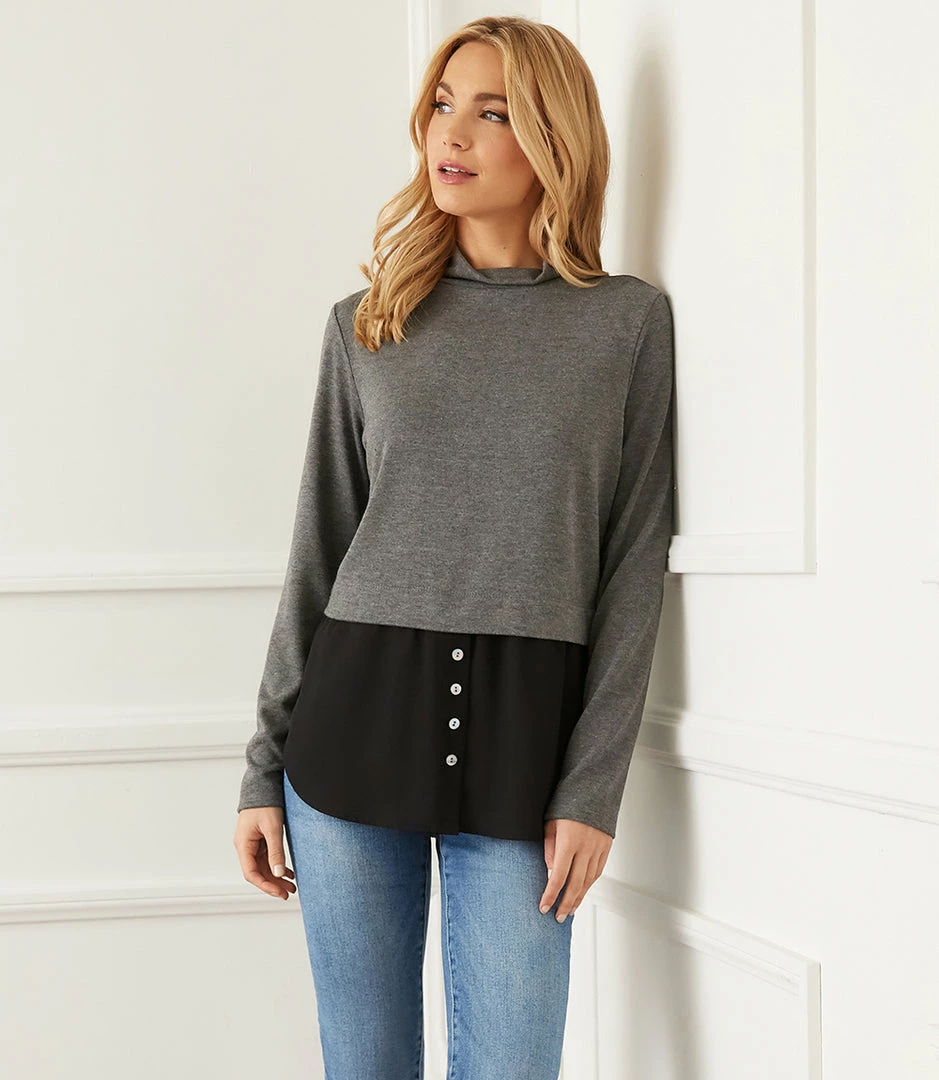 A button-down contrast hem brings a stylish layered illusion to this soft pullover sweater. This layered sweater is perfect for the office and beyond. The ultimate sweater: wear it dressed-up or-down any day of the week. Designed to deliver the illusion of a two-piece look by wearing only one simple style.