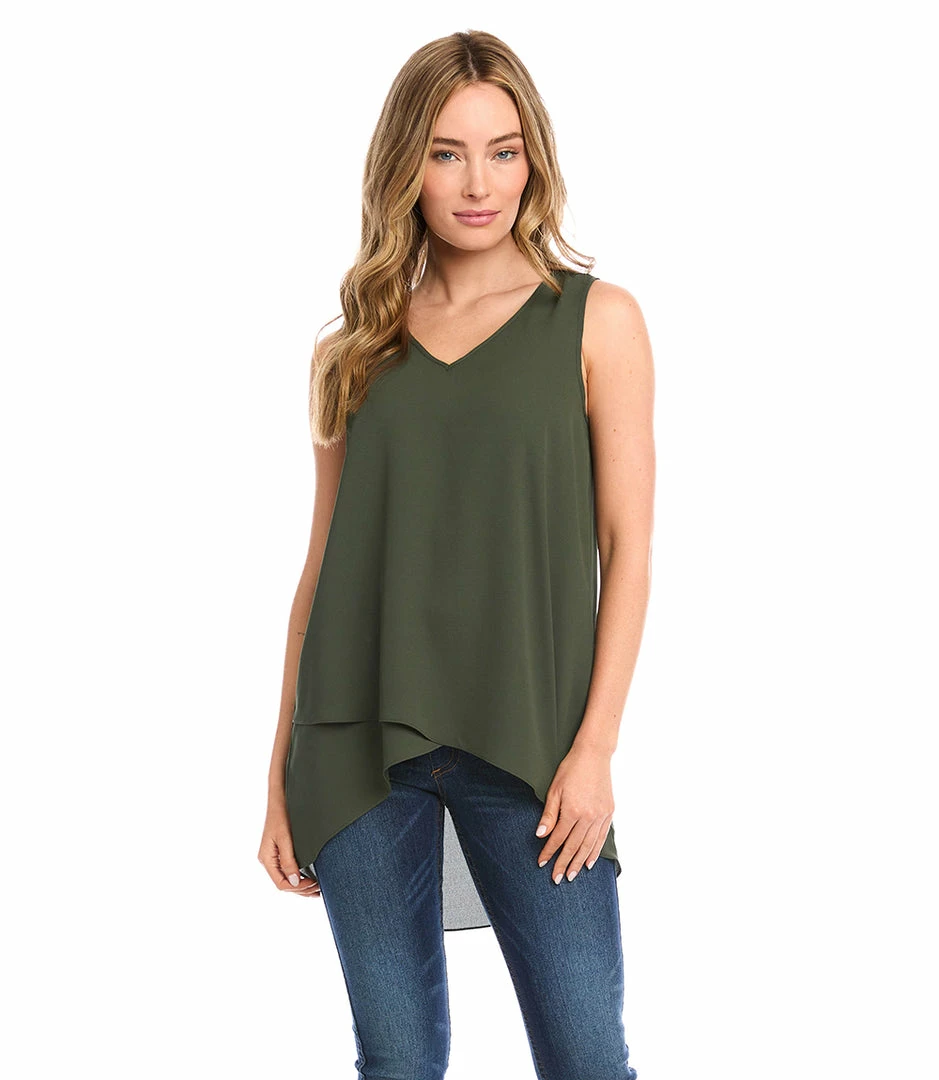 Breeze through summer in style with this silky crepe tank. The sleeveless v-neck silhouette falls into a crossover front that dips into a lower back hem.