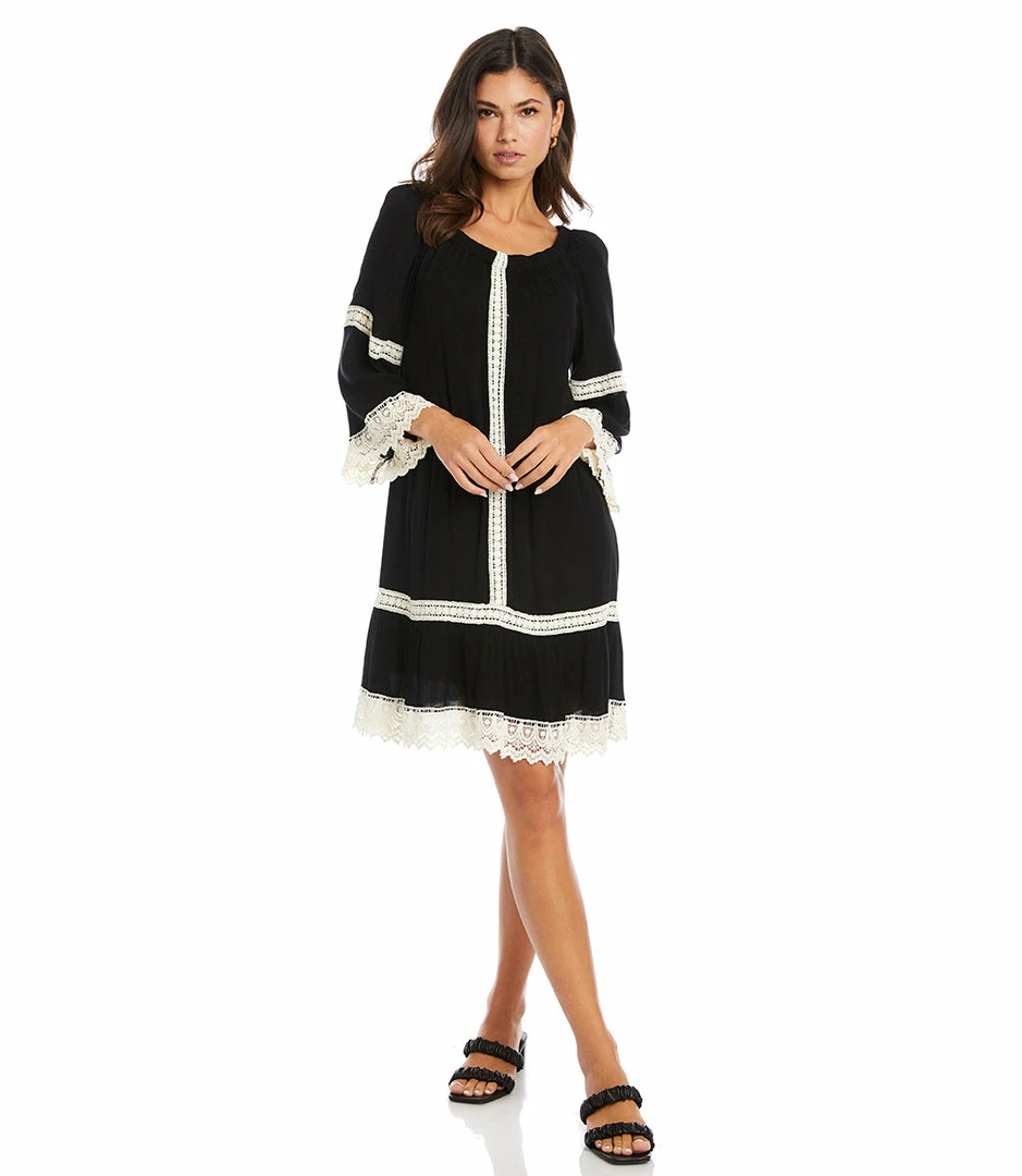 Designed to set a romantic tone, this billowy rayon gauze dress is detailed with delicate contrasting lace for an alluring finish.