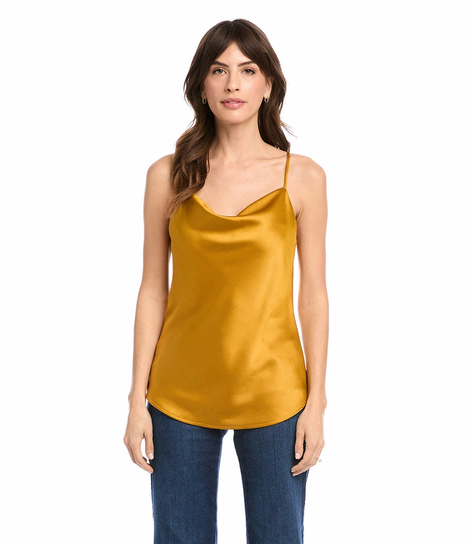 Cut from luxurious heavy satin, this top is detailed with an alluring draped neckline. The perfect layering piece – soft, shimmering, and easy to dress up or down.