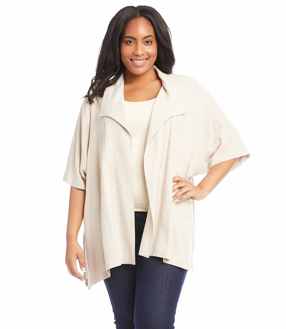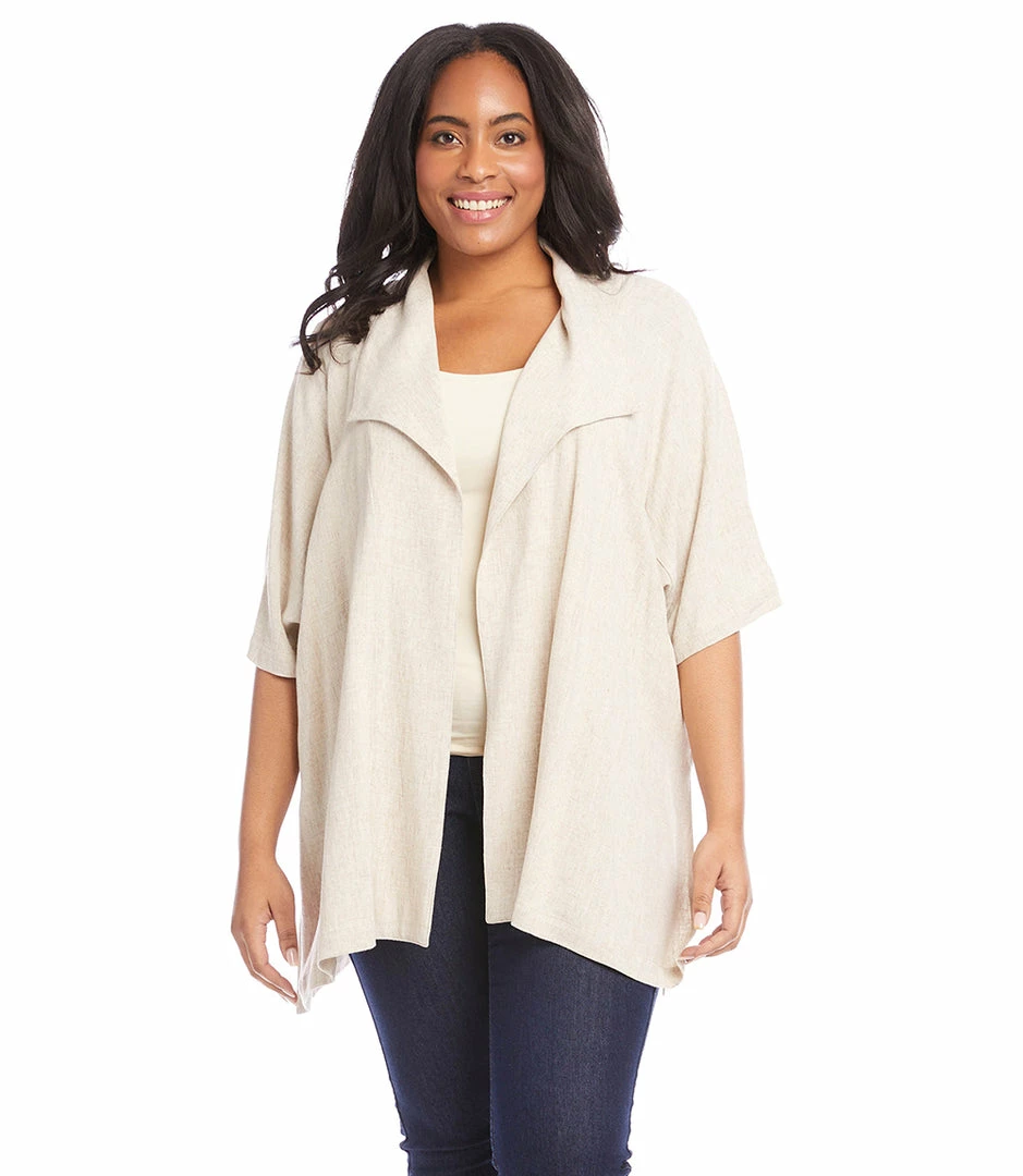 Made with a cool and breathable linen blend, this draped jacket serves as a versatile wardrobe staple with its short sleeves. It’s detailed with oversized lapels for a stylish finish.