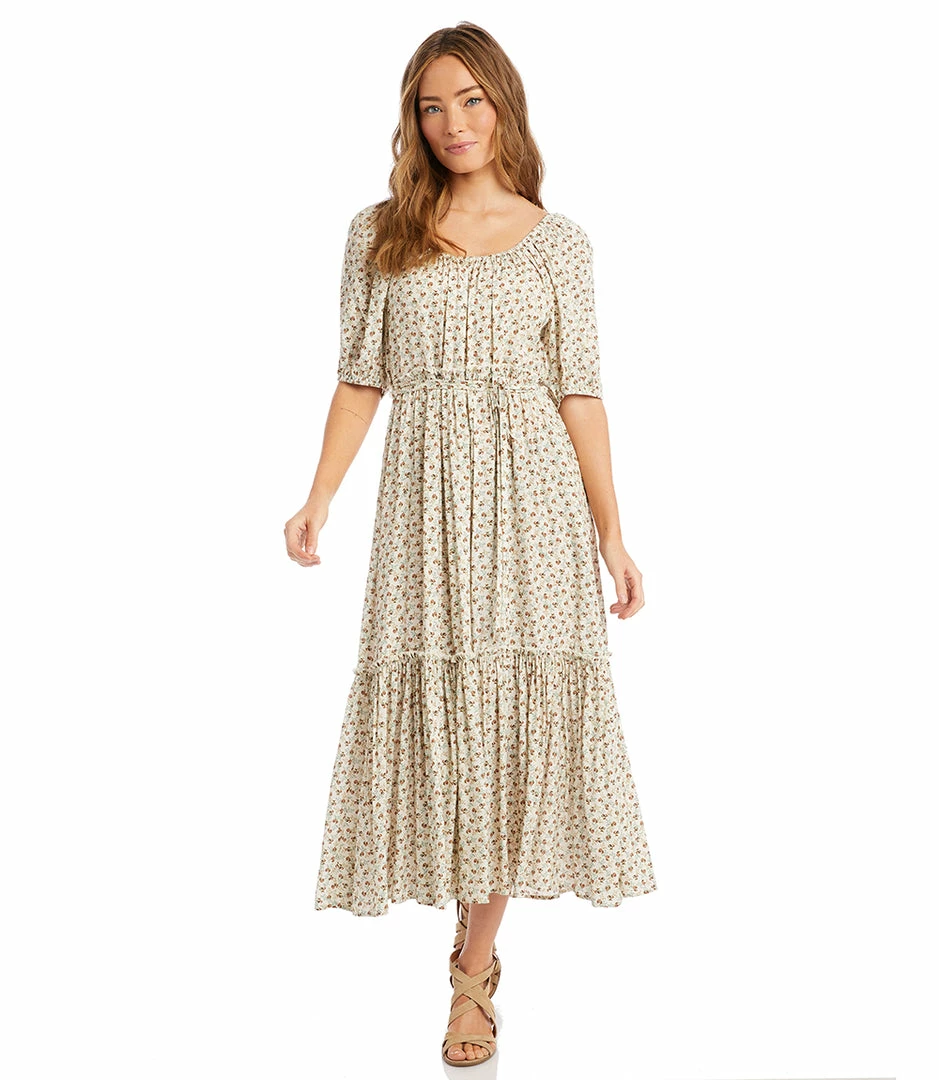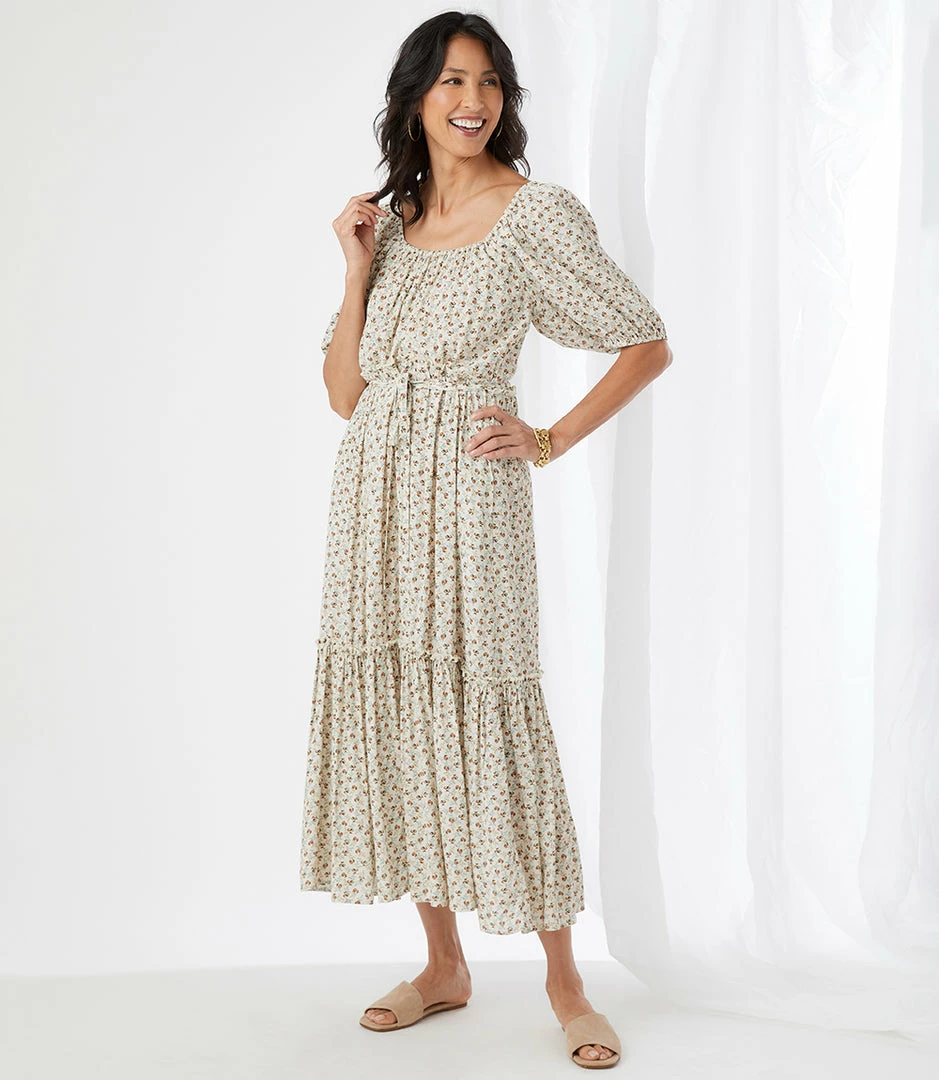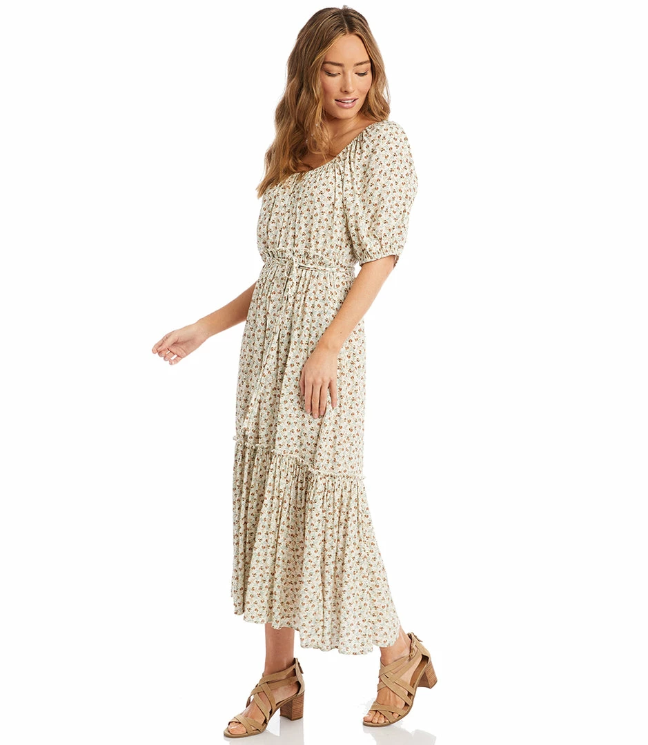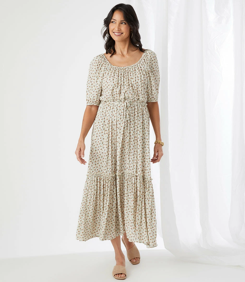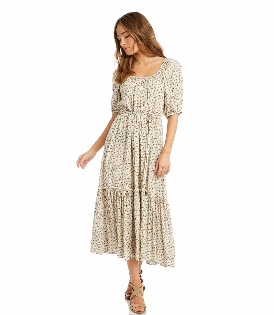 Perfect for brunch and beyond, this charming floral dress is a feminine favorite. Its bohemian styling provides an on-trend look, while the tiered midi silhouette offers soft movement. It also features a flattering cinched waist and matching belt.