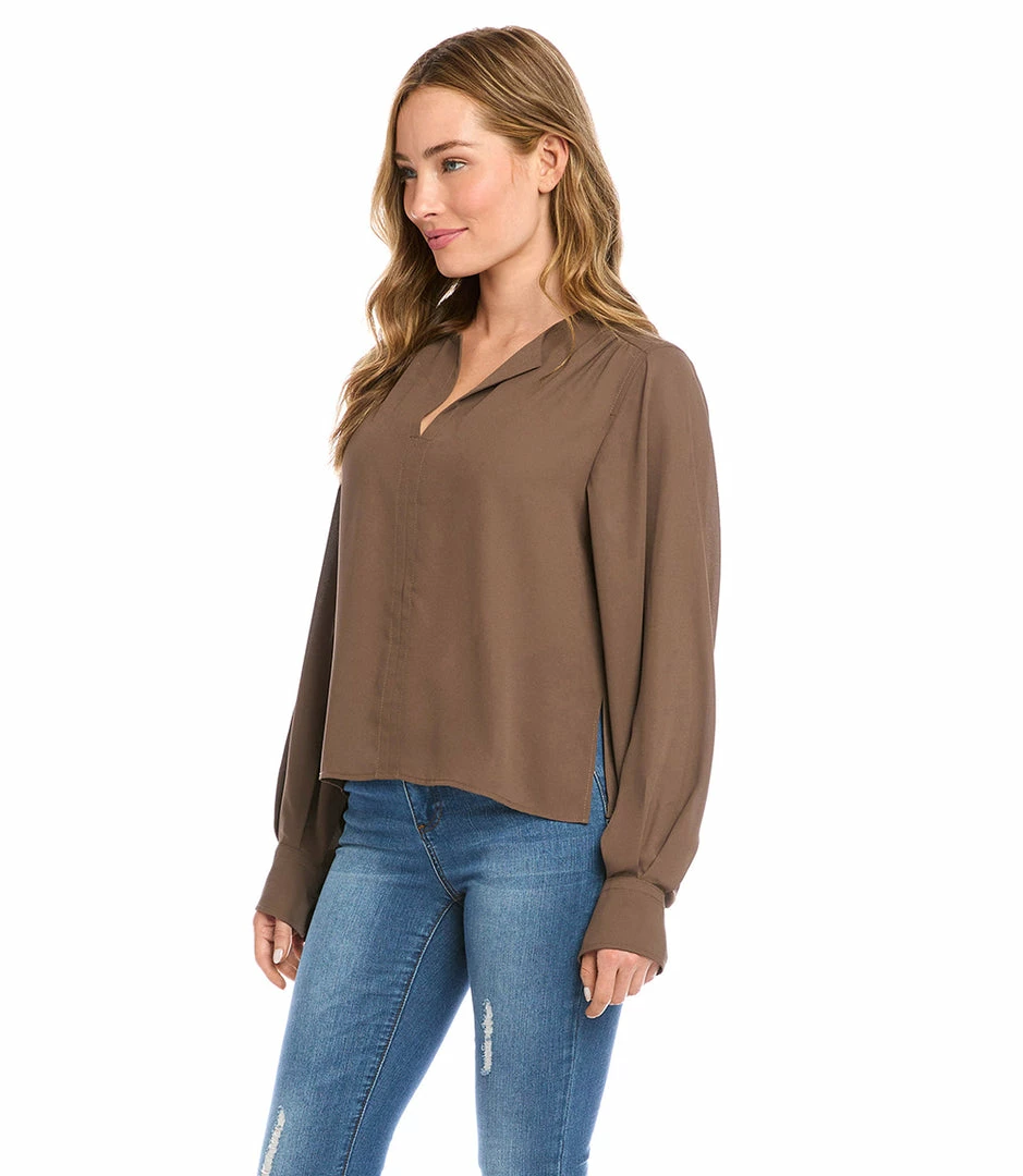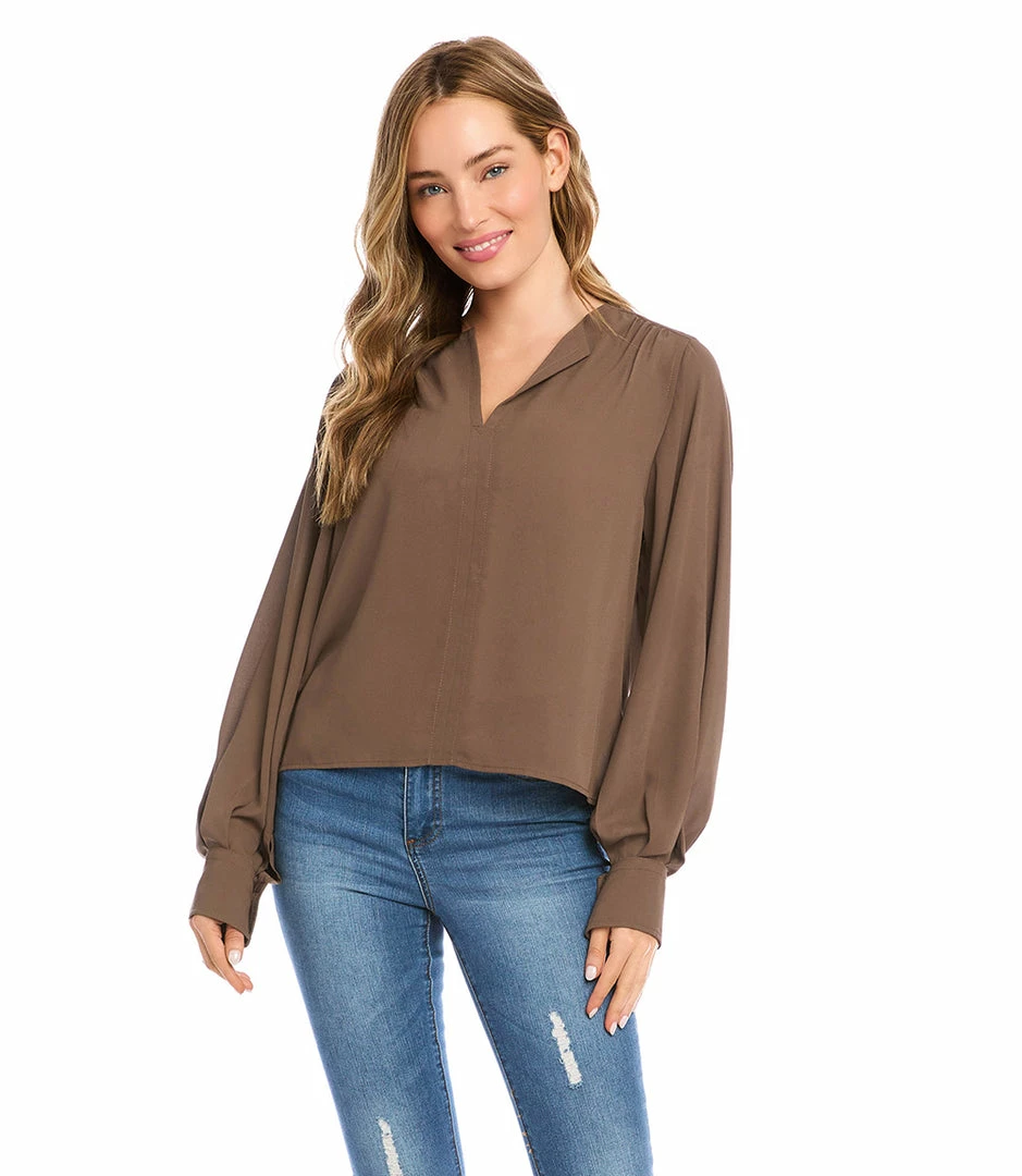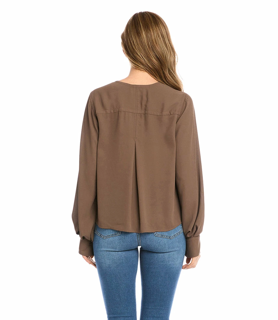 A modern front placket and romantic shirring at the sleeve distinguishes this crepe top. This top can easily transition from desk to dinner.