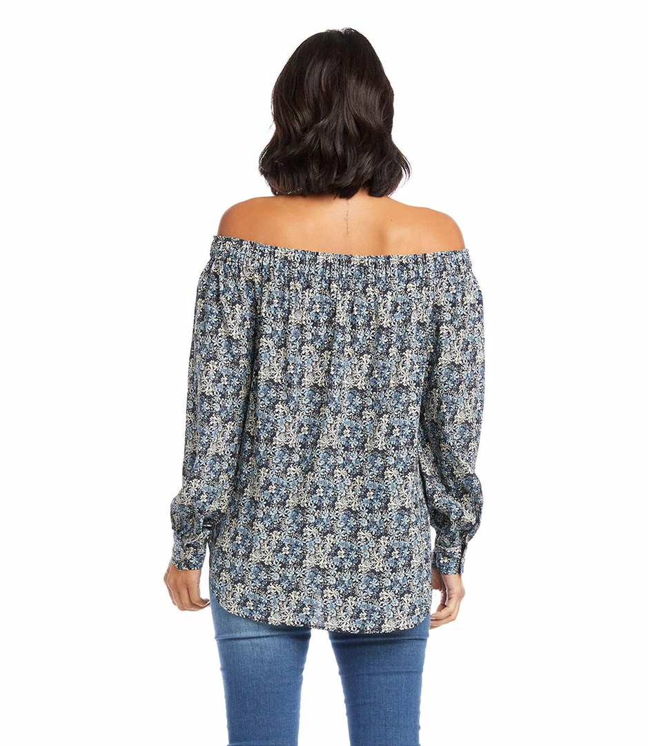 Embrace warmer weather in this billowy top covered in a charming vintage ditsy floral print. It features a shoulder baring neckline for sun kissed shoulders.