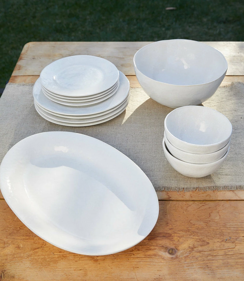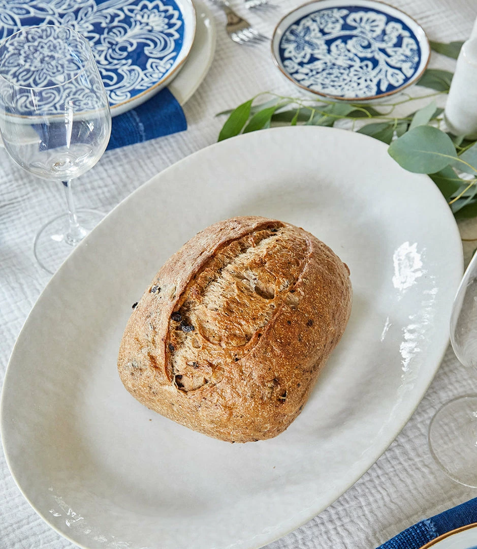 This glazed oval platter has an artisan-made look and feel with its subtle texture and natural undertones.