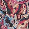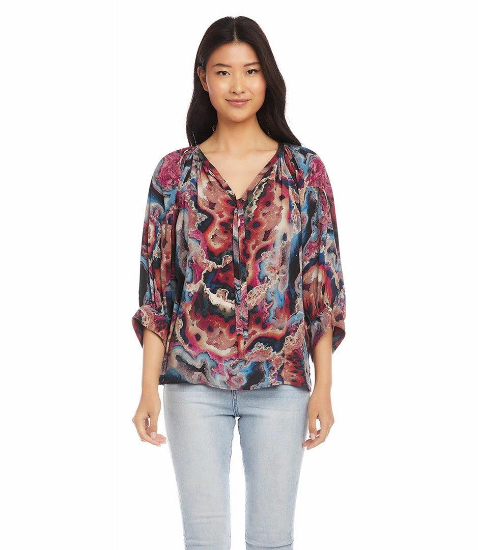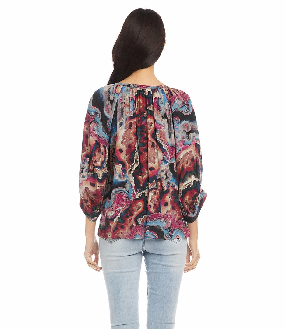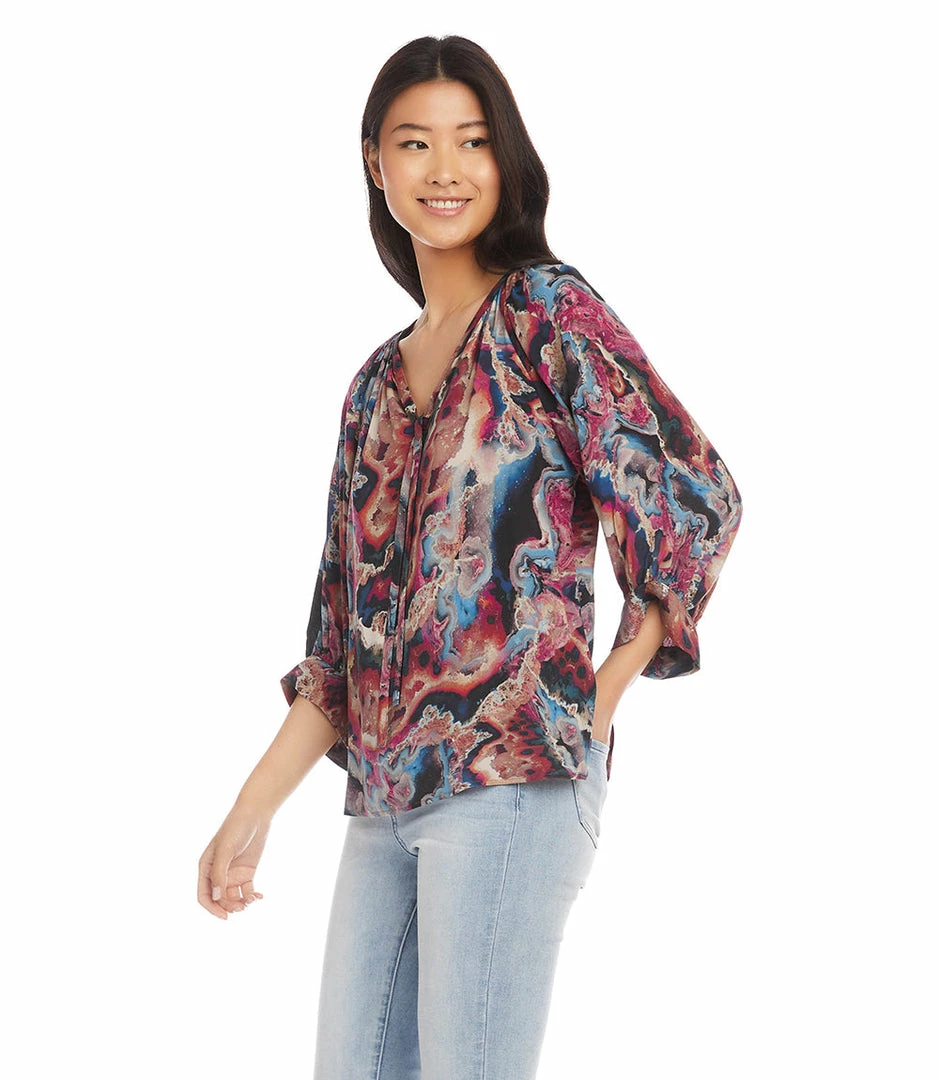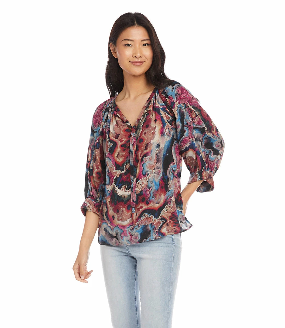 A mesmerizing marble print imported from Italy distinguishes this crepe top detailed with airy blouson sleeves. Its split neck with ties adds the perfect finishing.