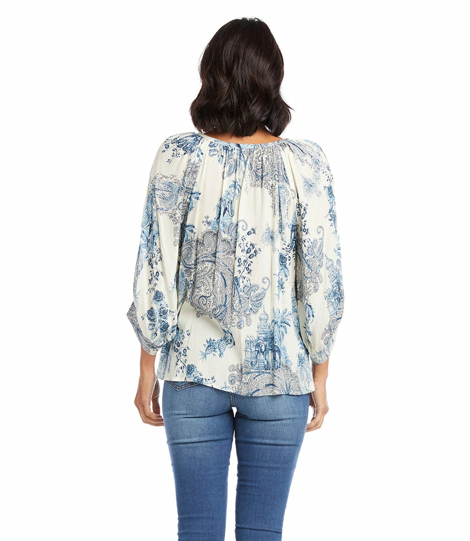 Inspired by the ceramic artistry of Southern Italy, this feminine top channels the hand-painted tiles of the Amalfi Coast. This top features billowy blouson sleeves and a charming paisley scarf print. Its split neck with ties adds the perfect finishing.