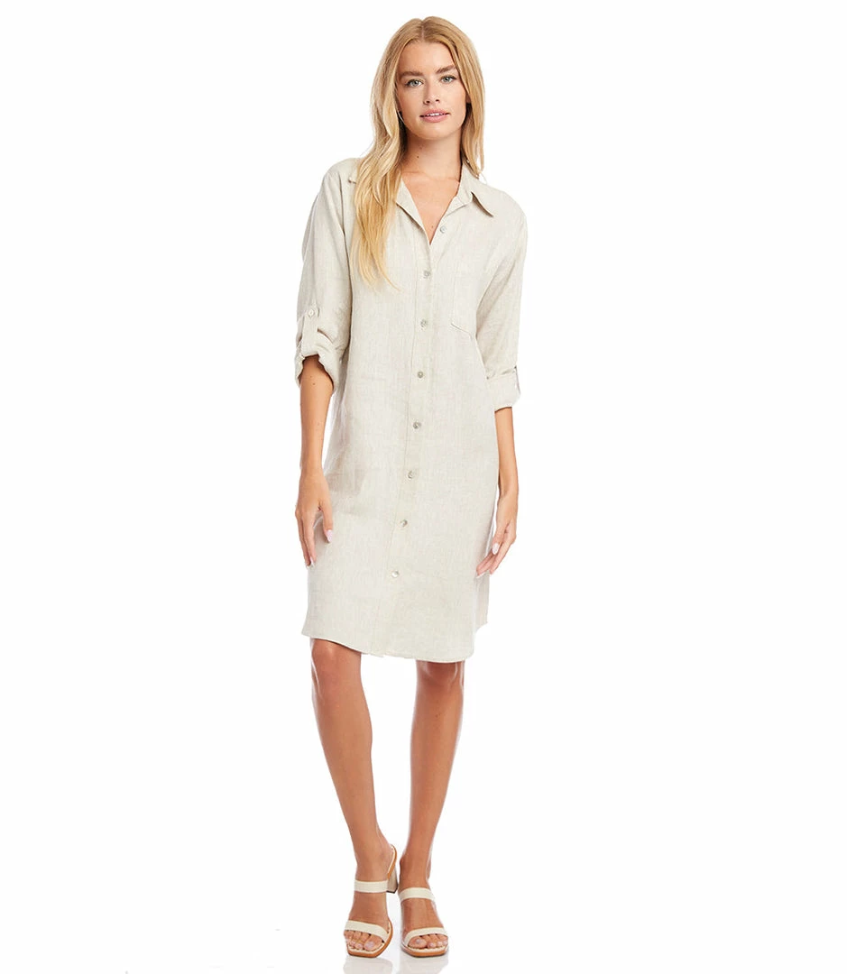 This relaxed dress is accented with natural mother-of-pearl shell buttons. Linen is both cool in warm weather and warm in cool weather.