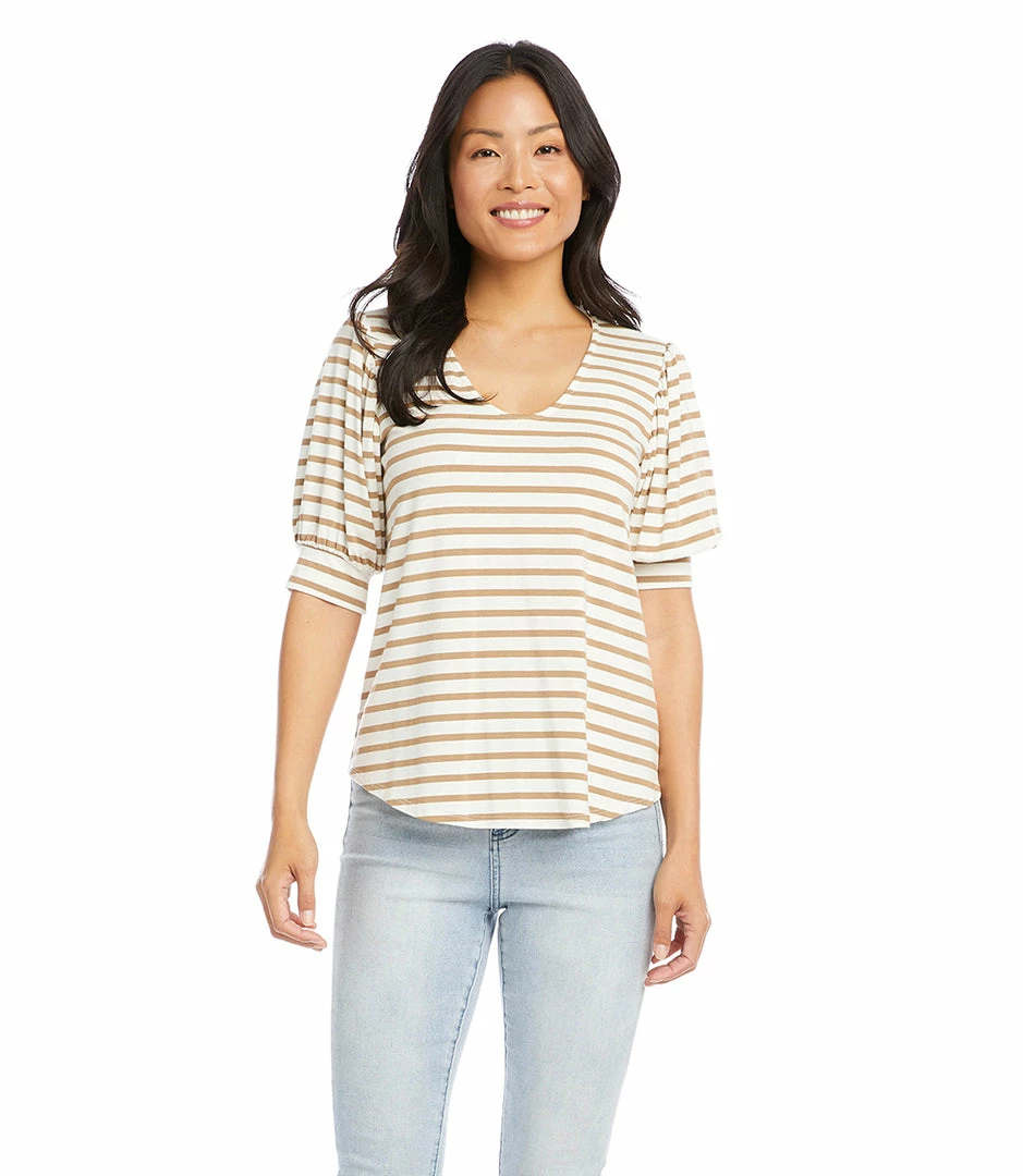 Statement-making puff sleeves define this striped knit blouse that can be worn for work or the weekend.