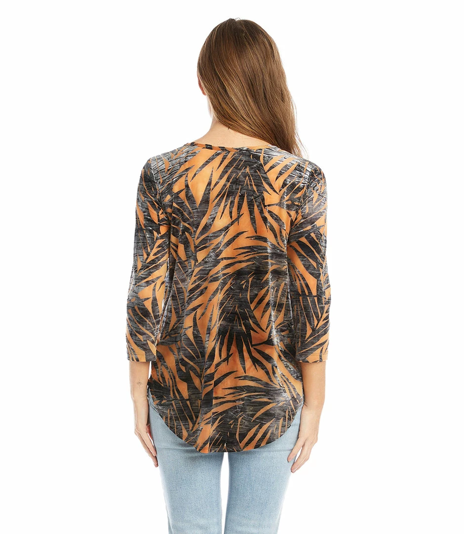 Textural beauty is found in this burnout top covered in an alluring palm leaf design. It pairs perfectly with your favorite denim.