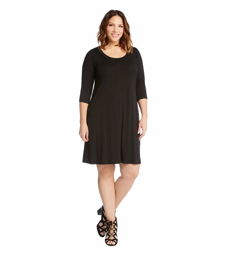 A part of the Karen Kane Little Black Dress Collection, this basic black a line is a must have staple in every woman’s wardrobe. The easy pull on silhouette flows away from the body, hiding flaws, while the basic crew neckline covers the front in streamlined sophistication. Dress it up or down with pumps and fun jewelry or basic tights and booties for something more transitional.