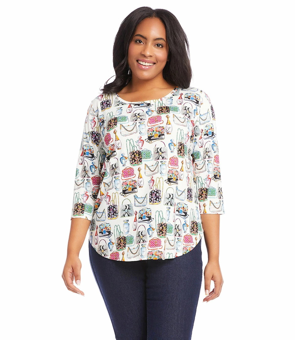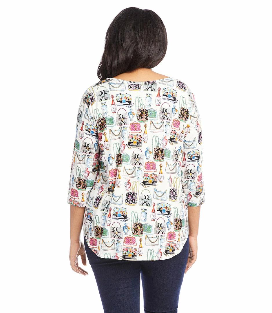 Brighten your wardrobe with this soft knit top covered in an array of purses and perfumes. It pairs perfectly with your favorite denim.